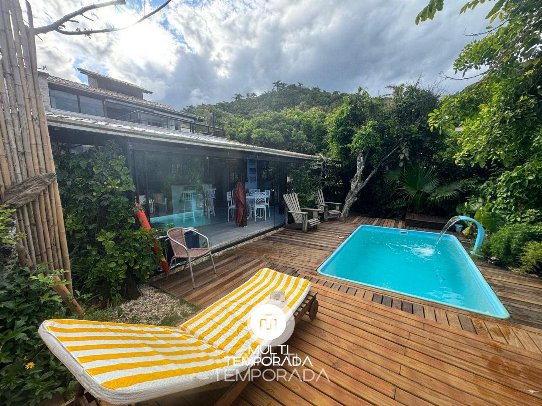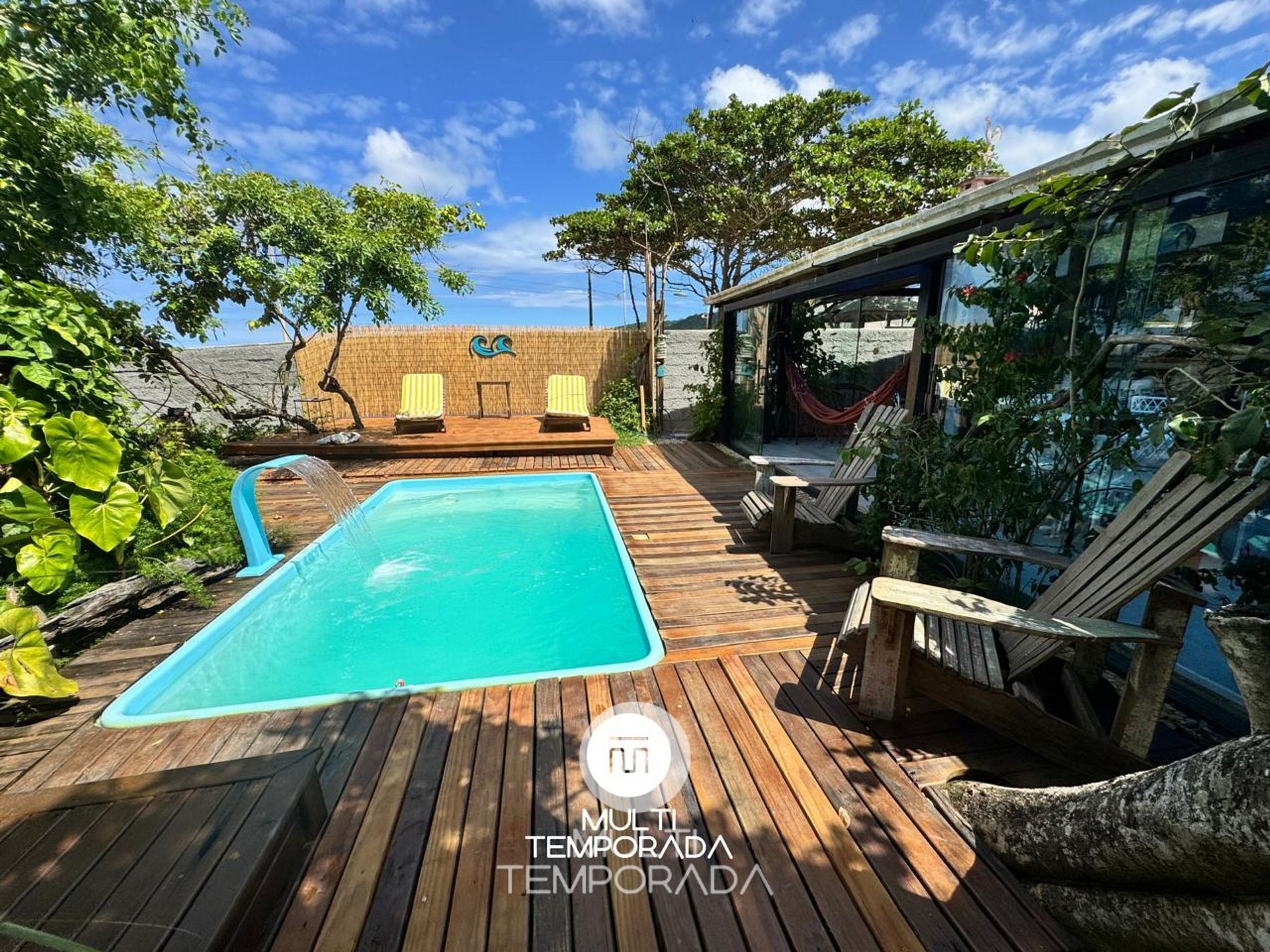 Área externa com jardim e piscina, perfeita para relaxar após a praia