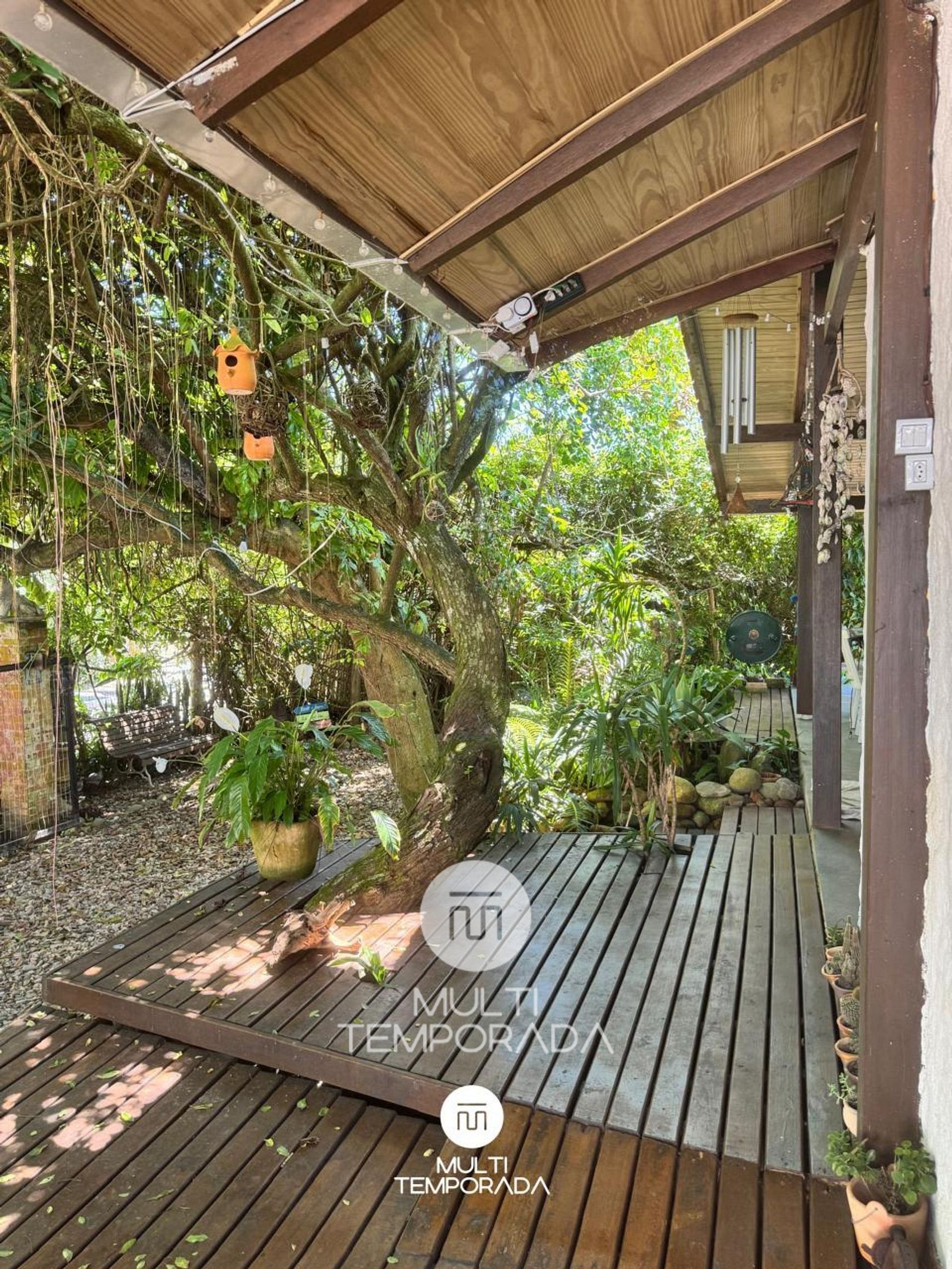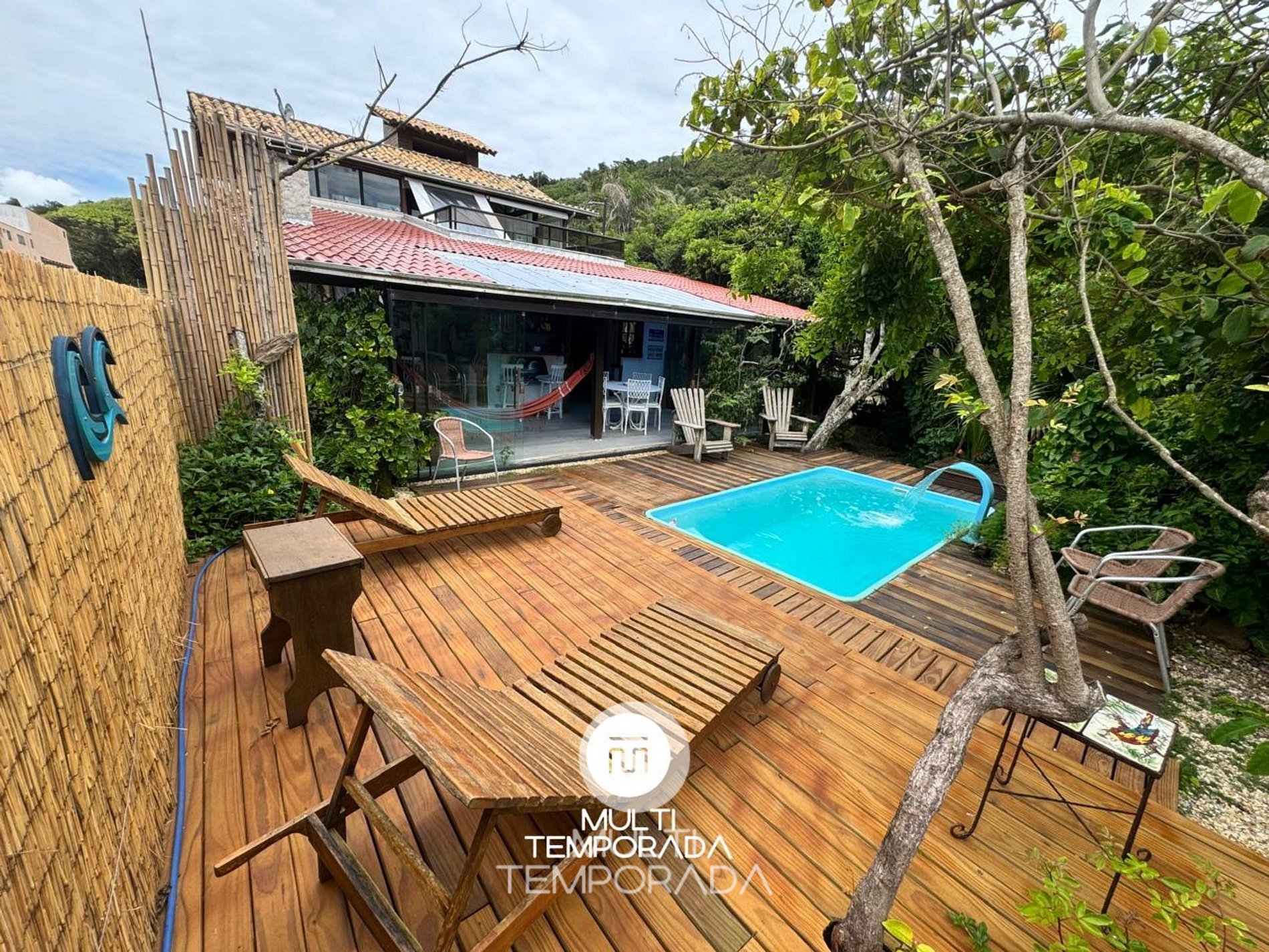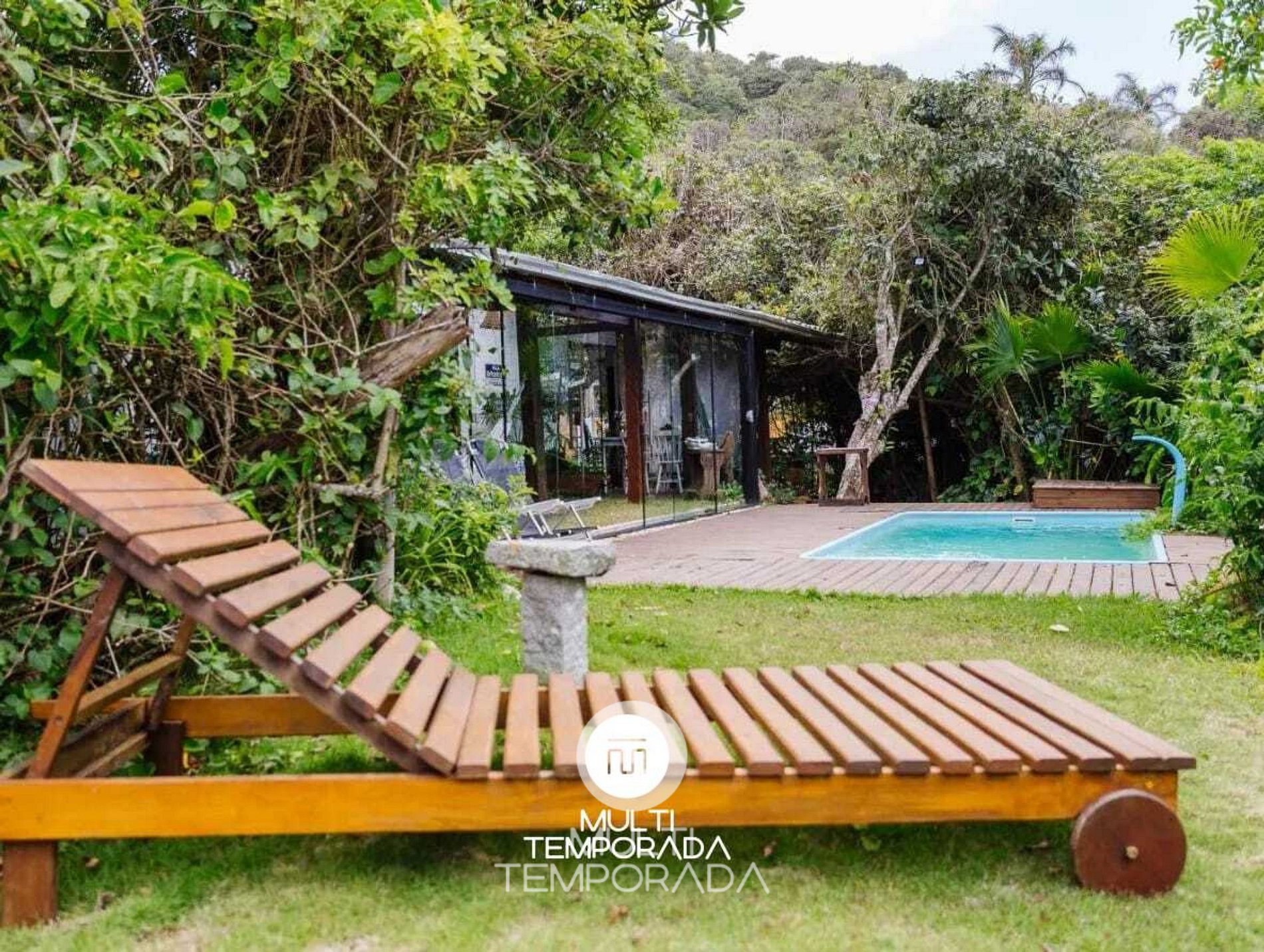 Área externa com jardim e piscina, perfeita para relaxar após a praia