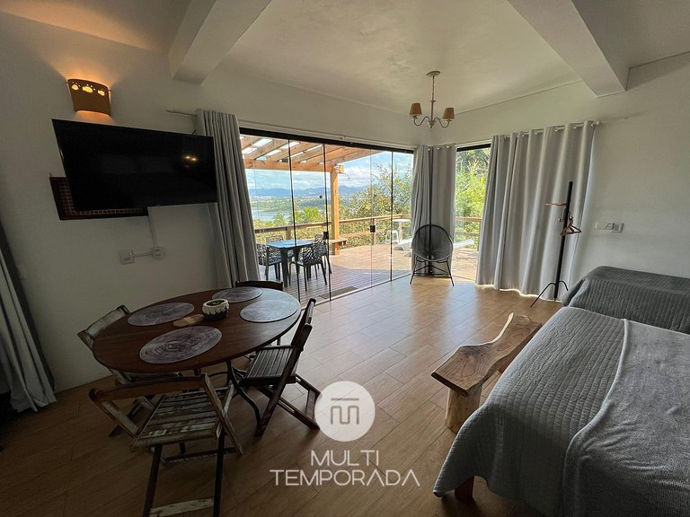 Chalé super completo, cama confortável, e com uma vista espetacular da lagoa de Ibiraquera !