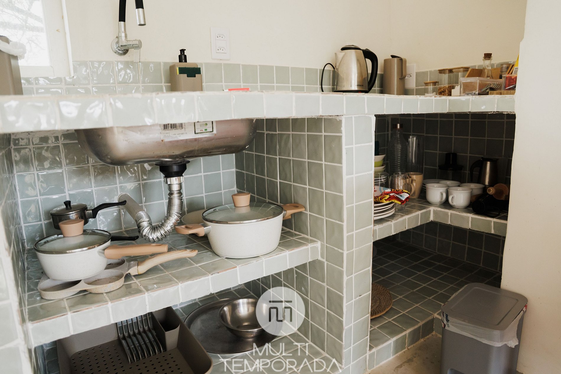 Cozinha completa: fogão elétrico, frigobar e chaleira elétrica.