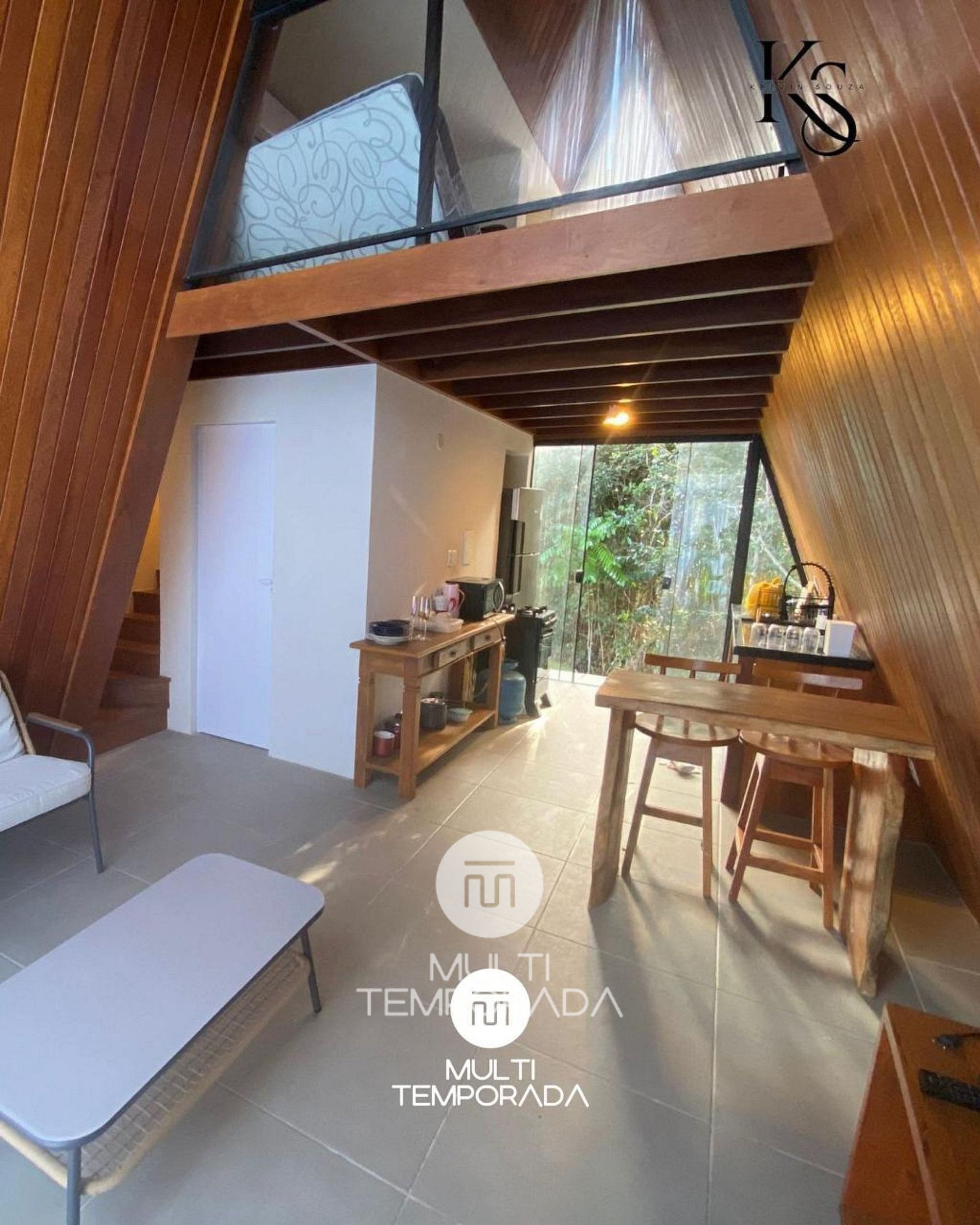 O chalé conta com cozinha completa, equipada para estadias práticas e agradáveis: