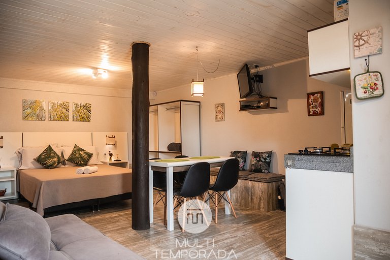 O Studio é amplo (40m²), confortável e climatizado. Conta com banheira de imersão para maior conforto dos hóspedes em um banheiro privativo luxuoso.