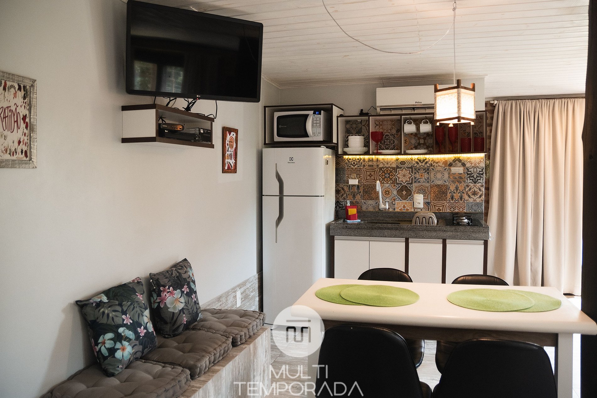 Cozinha compacta com: geladeira, fogão, micro-ondas, torradeira, chaleira elétrica, bem como utensílios de cozinha. Além disso ela possui TV Smart 32'' e varanda com rede para o seu descanso.