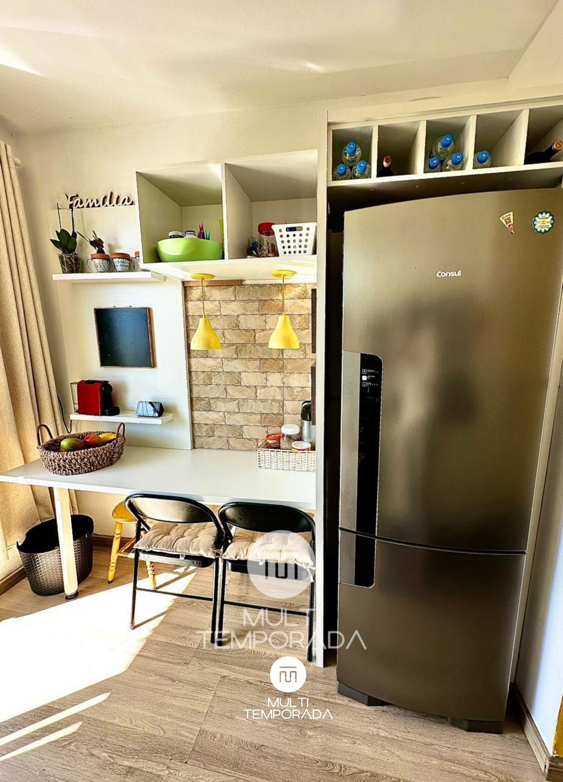 A cozinha é totalmente equipada para atender às necessidades do dia a dia, oferecendo praticidade e conforto durante toda a estadia. Conta com fogão, geladeira, forno e micro-ondas, sendo ideal tanto para um café da manhã tranquilo quanto para preparar refeições completas em família.