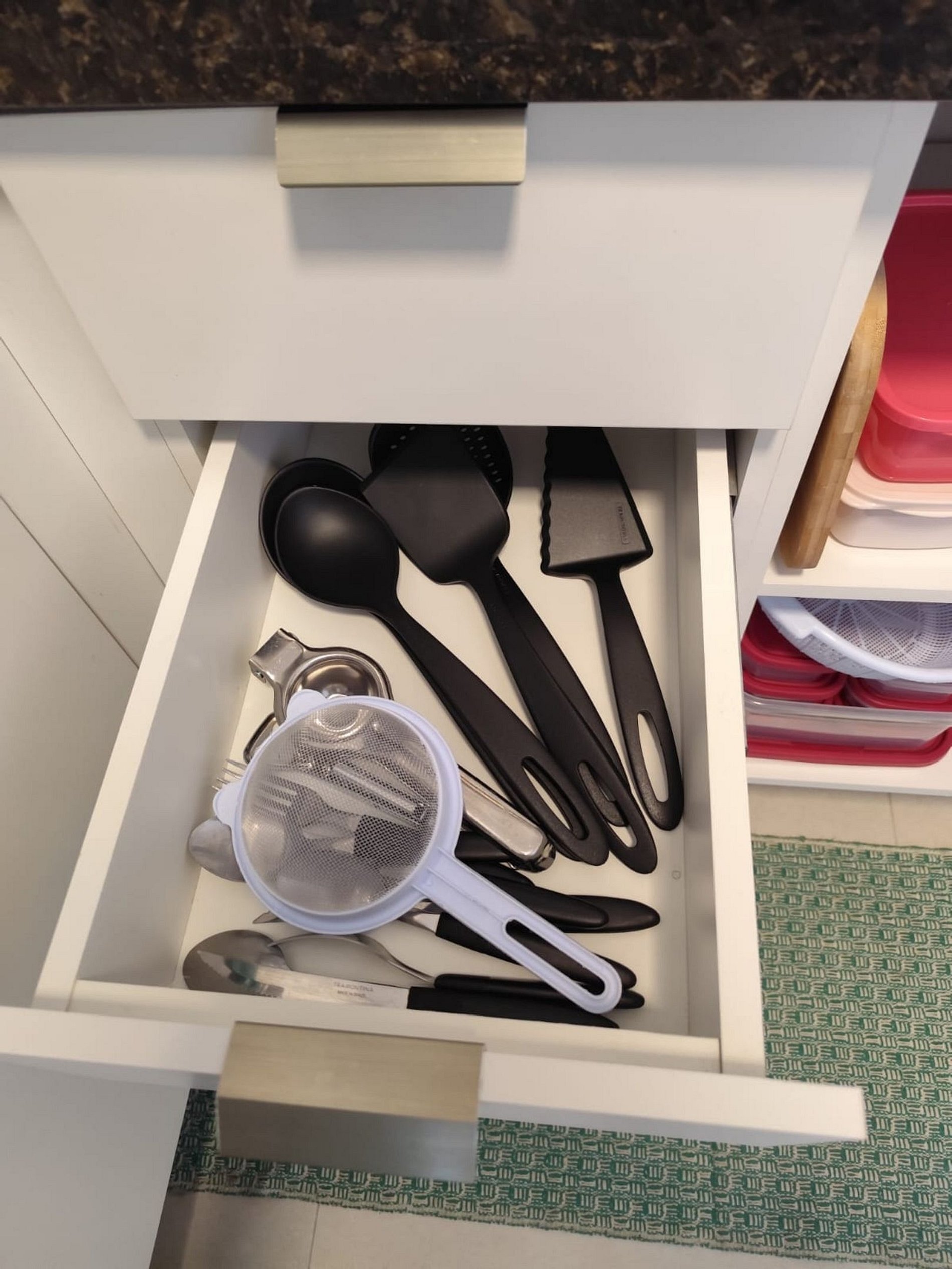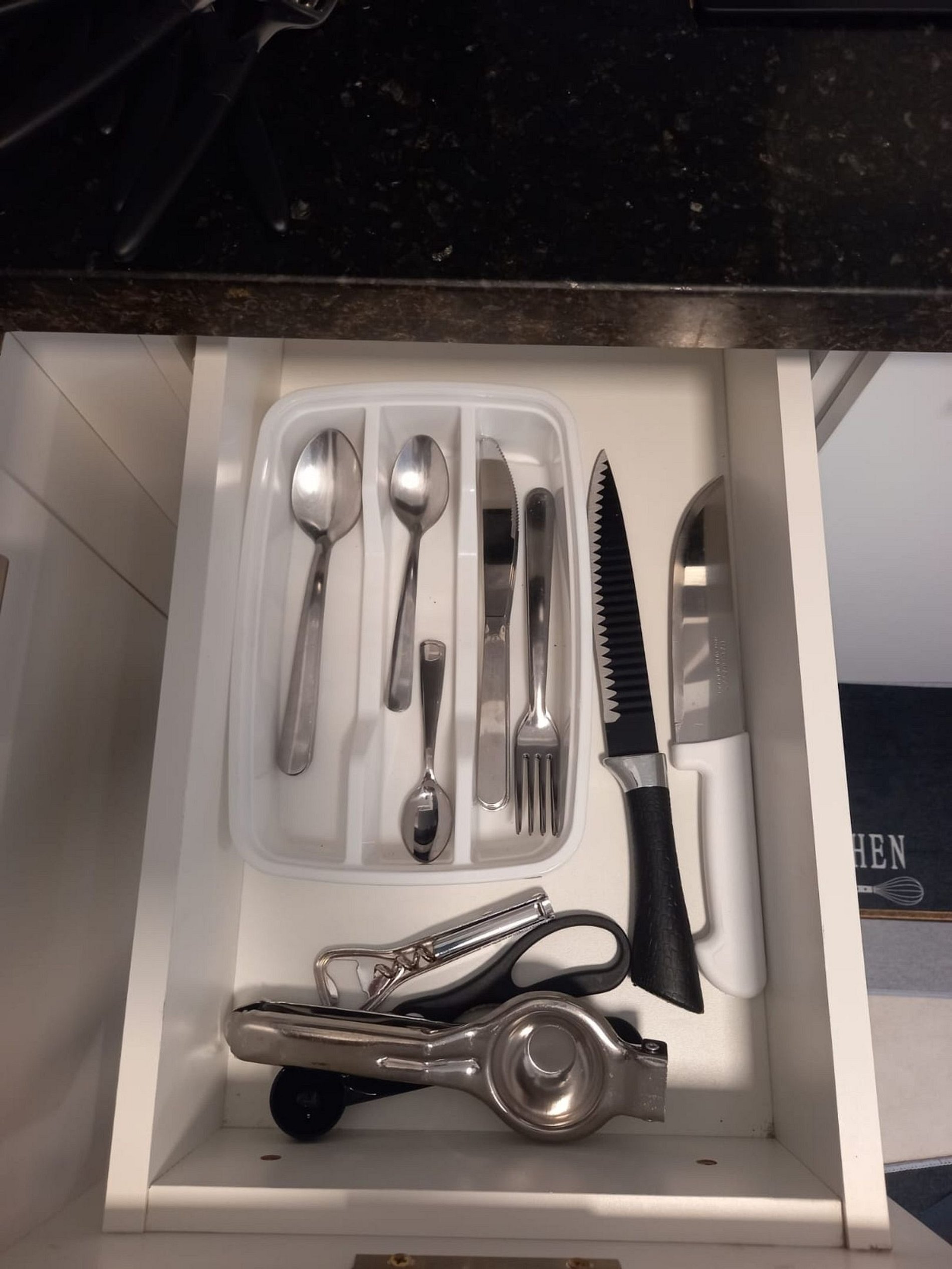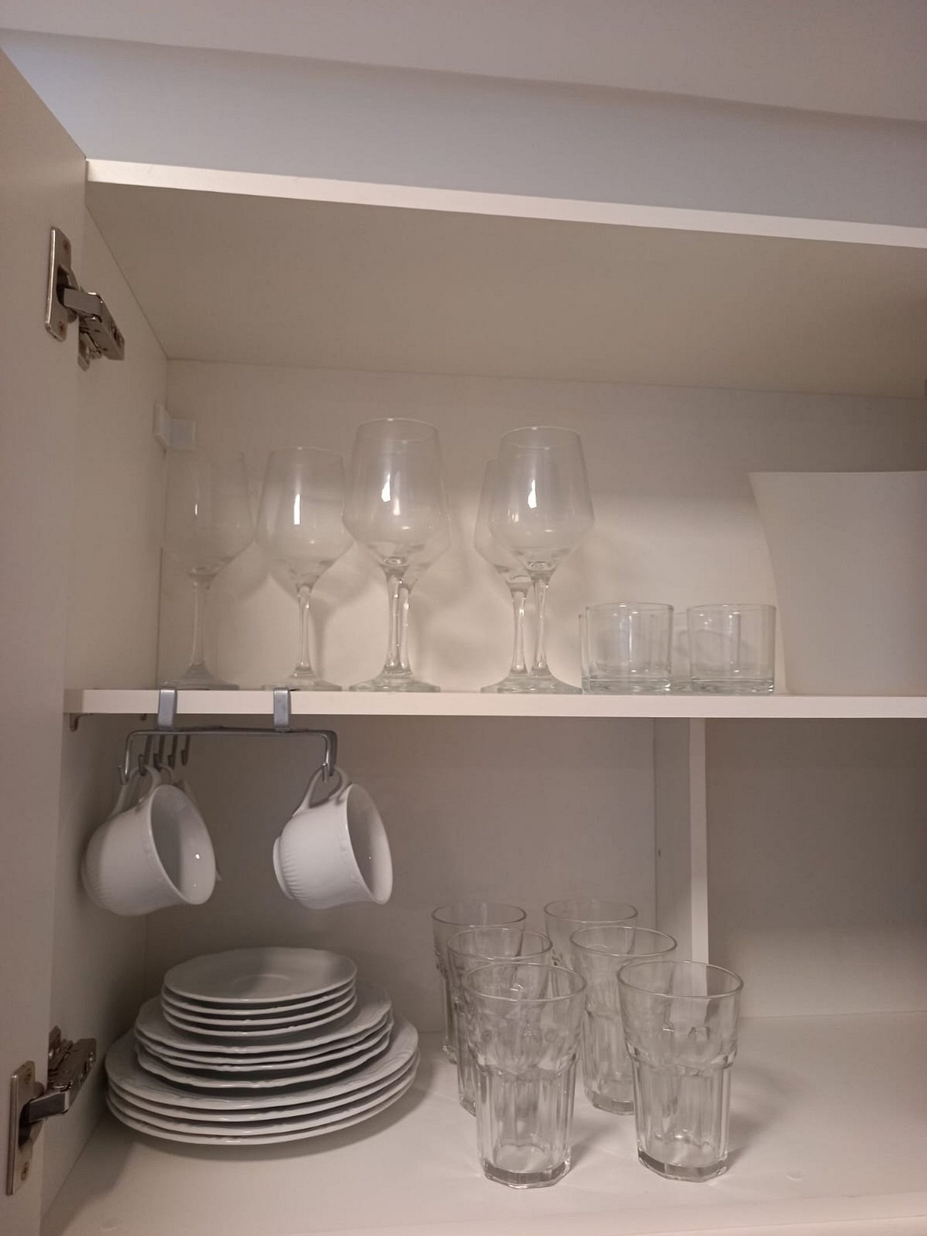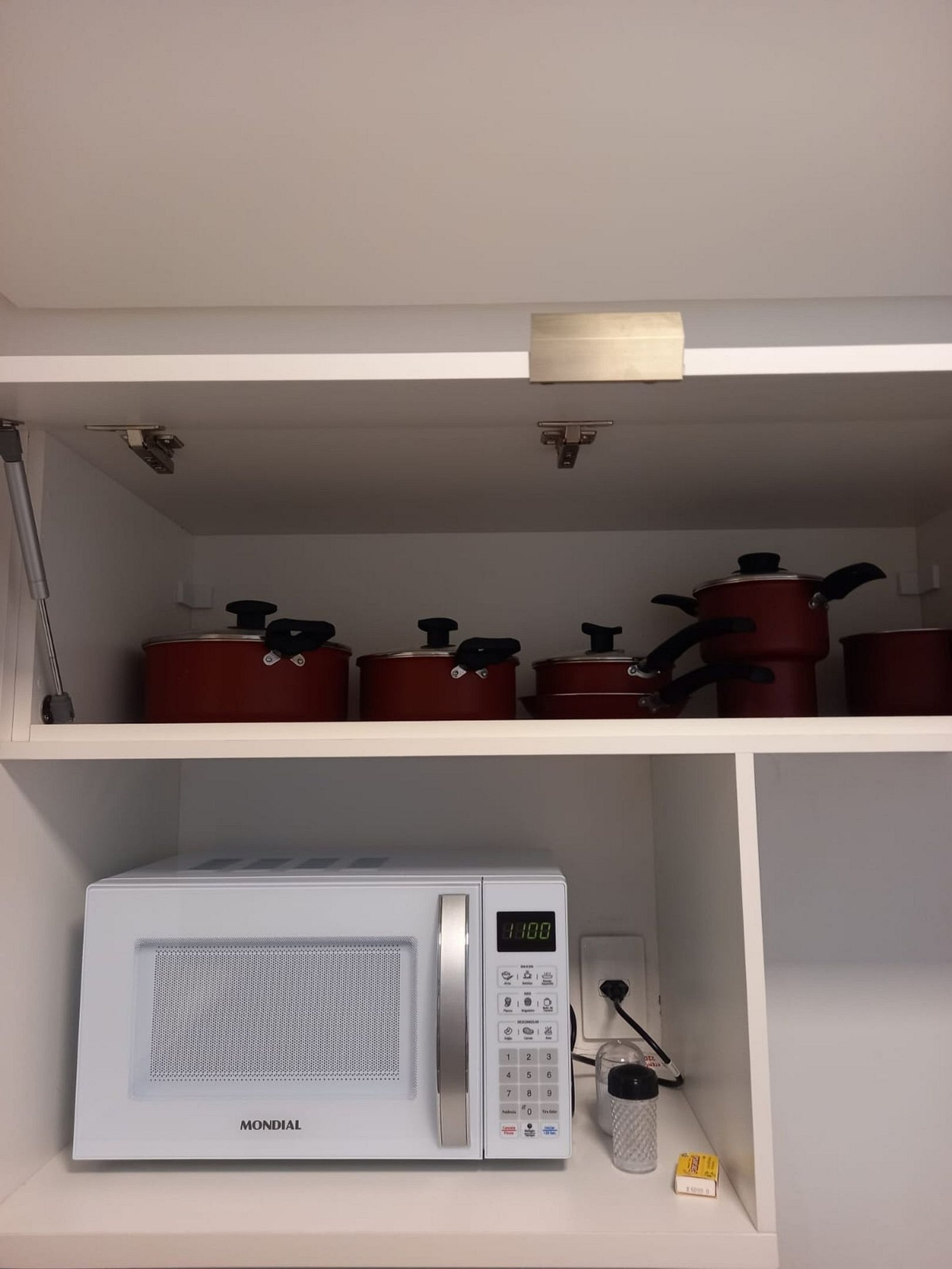 Cozinha equipada com fogão, geladeira, micro-ondas, louças e talheres.