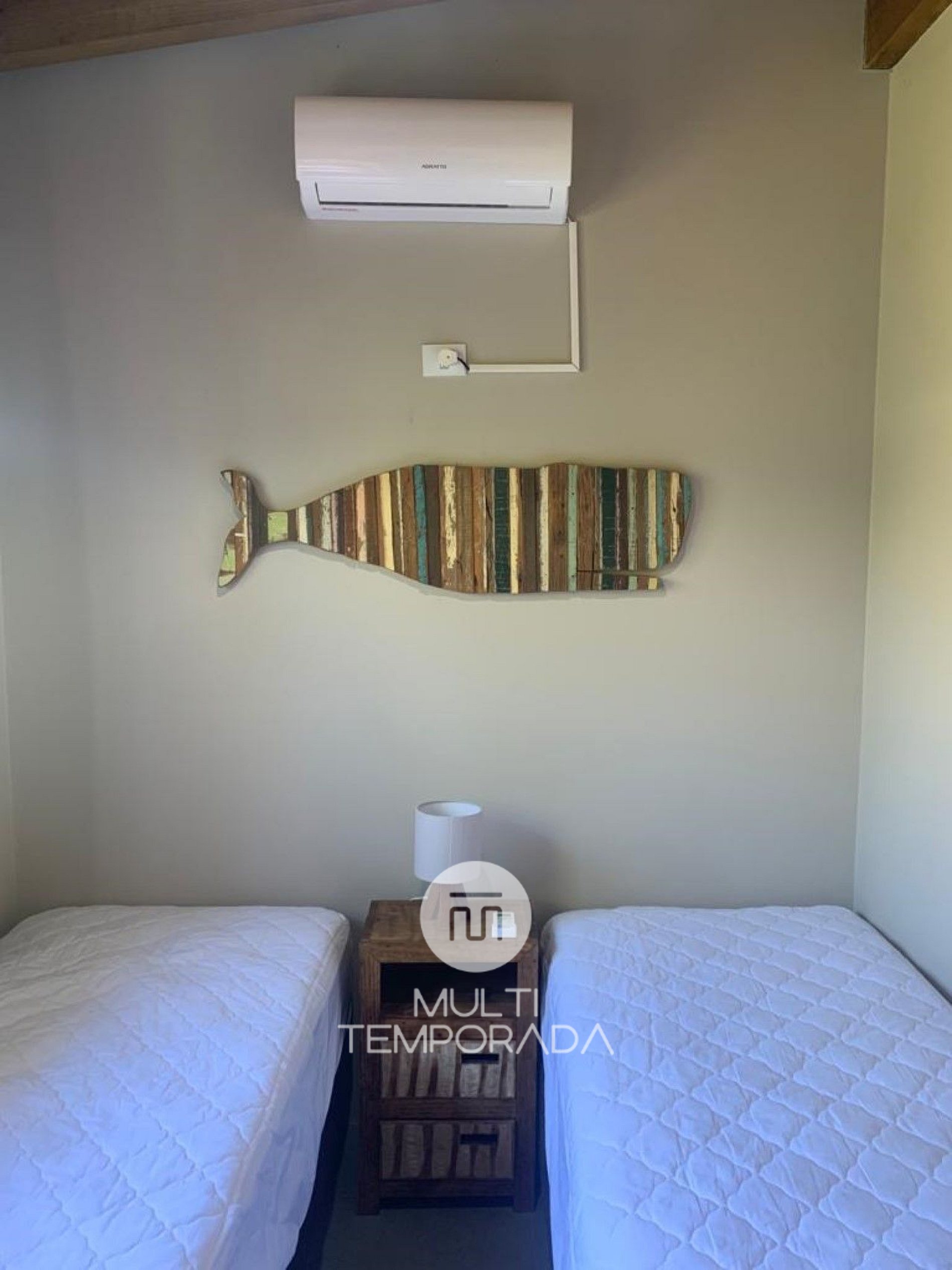 Nossa estrutura oferece: 2 suítes com ar-condicionado. Uma possui cama box queen-size e a outra duas camas box de solteiro. Além disso, temos um colchão adicional de solteiro. A capacidade total da casa é de 5 pessoas.
