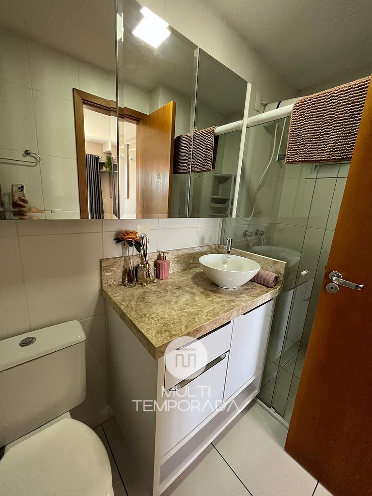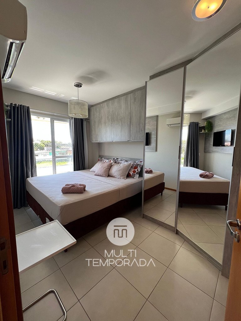 São 70 metros quadrados com varanda com churrasqueira, suíte com ar-condicionado, Cama King e TV Smart, quarto com Cama Queen e ar-condicionado, cozinha e sala integrados com ar-condicionado split também. A cozinha é equipada com Fogão, forno, geladeira com freezer, microondas, liquidificador, sanduicheira, garrafa térmica, chaleira e coador, panela de pressão e todos utensílios necessários para fazer uma boa refeição. A sala climatizada possui uma TV Smart de 42". Possuímos Wi-Fi no apartamento, além da internet oferecida pelo próprio condomínio, rouparia de cama e banho completa, ferro de passar, secador de cabelo e máquina de lavar roupas.