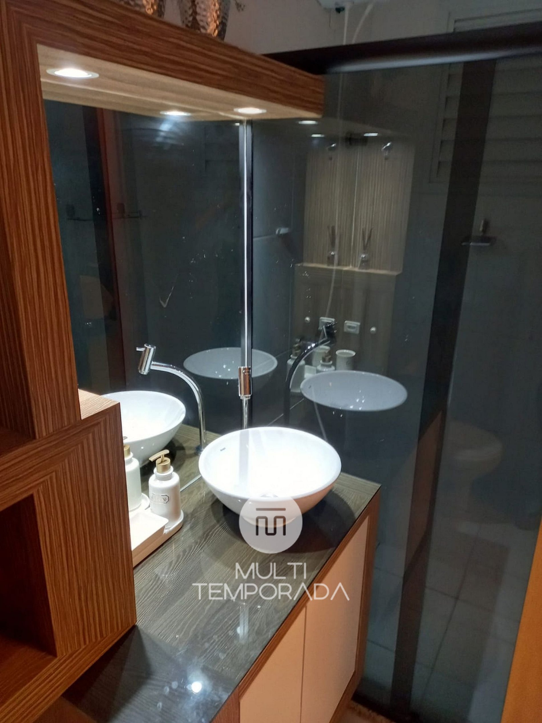 São 62 metros quadrados com varanda com churrasqueira, dois dormitórios climatizados, sendo uma suíte.