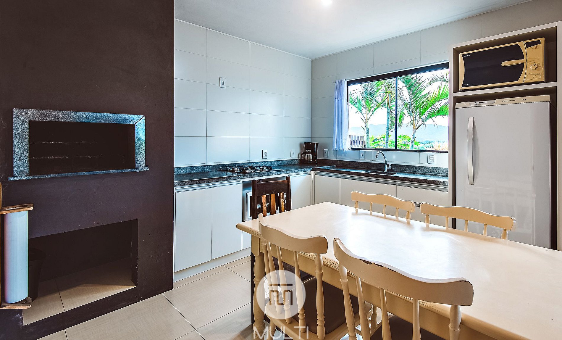 Cozinha completa: Churrasqueira, geladeira, microondas, fogão 4 bocas e forno elétrico, liquidificador, sanduicheira, chaleira elétrica, cafeteira, louças e panelas;
