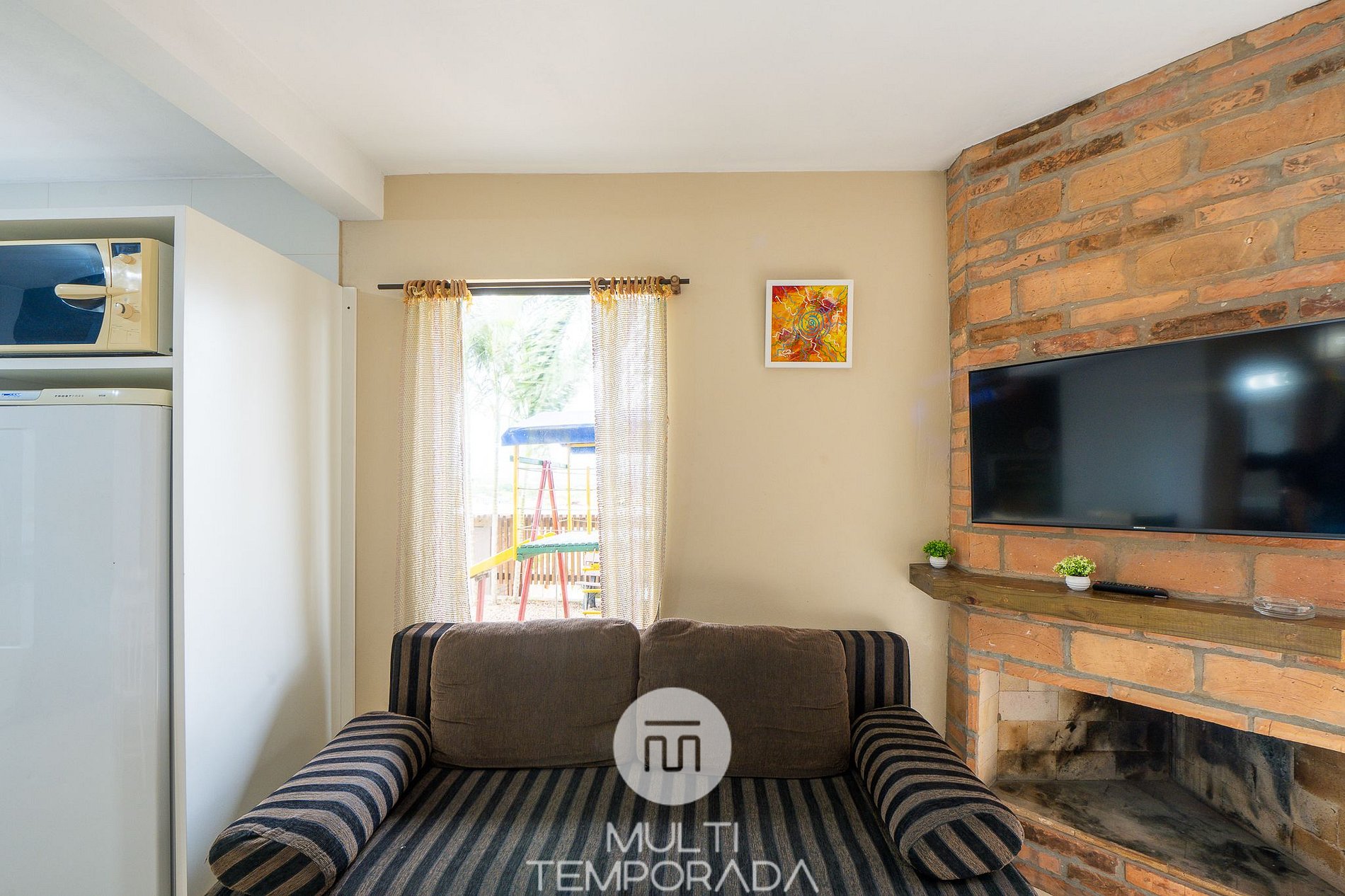 Sala de Estar: 2 Sofás-cama de solteiro, lareira interna à lenha, TV Smart 43 com canais pay-per-view;
