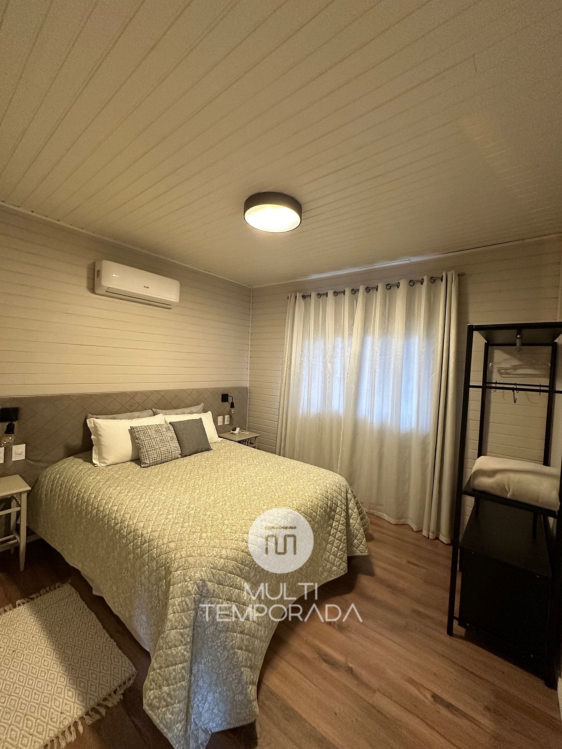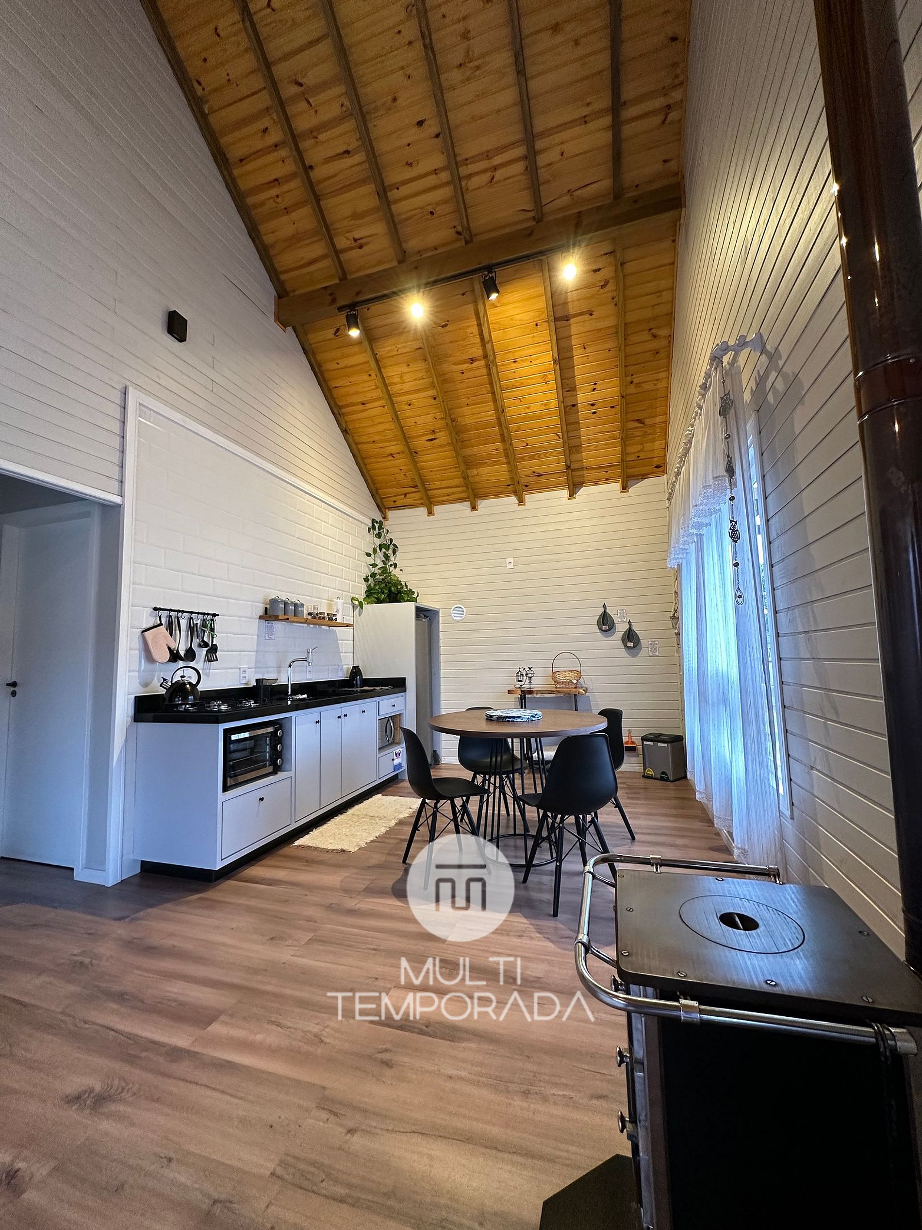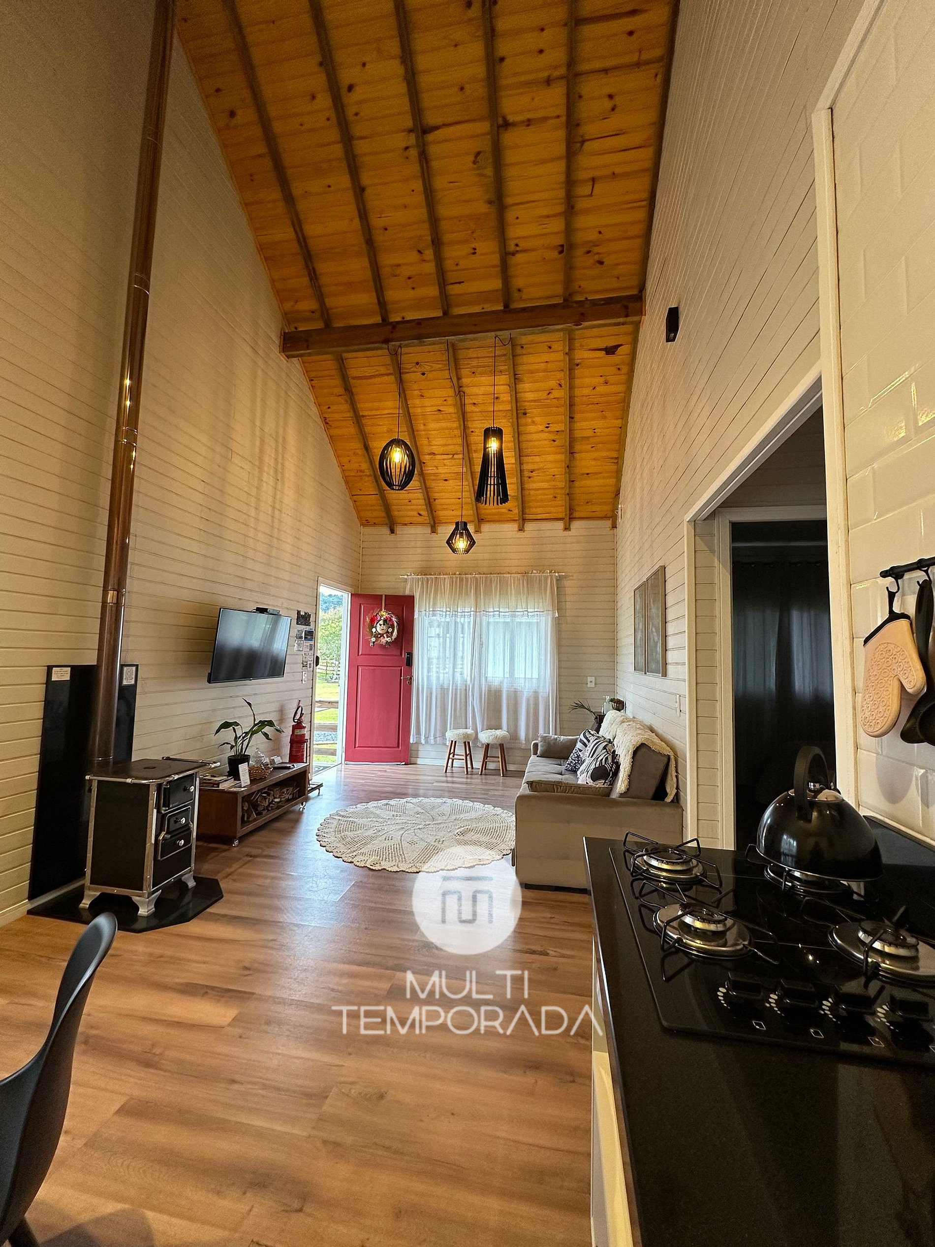Comodidades da unidade: TV Smart 42'', fogão à lenha, internet Wi-Fi de 500 mega, secador de cabelo individual no banheiro, rouparia de cama completa, travesseiros e cobertores e toalhas de banho.