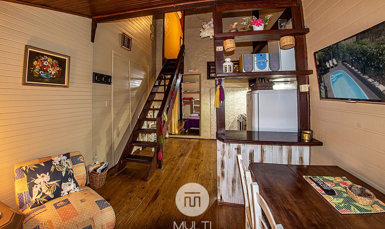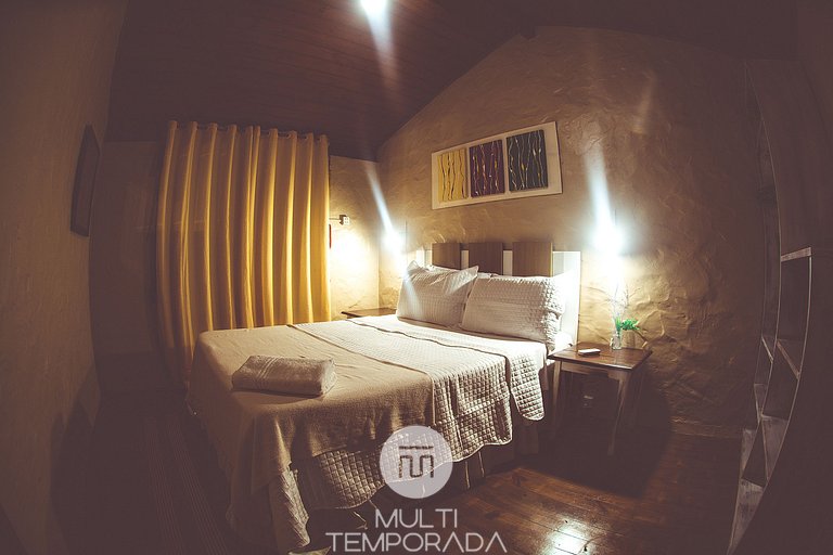 Dormitório: Piso Superior, Cama de Casal e Ar-Condicionado Quente e Frio;