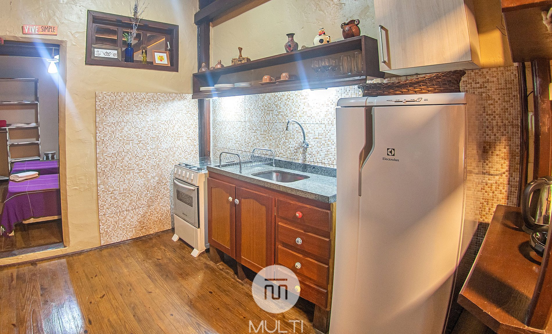 Cozinha Completa: Fogão, forno, geladeira com freezer, chaleira elétrica, liquidificador, torradeira, louças e talheres: