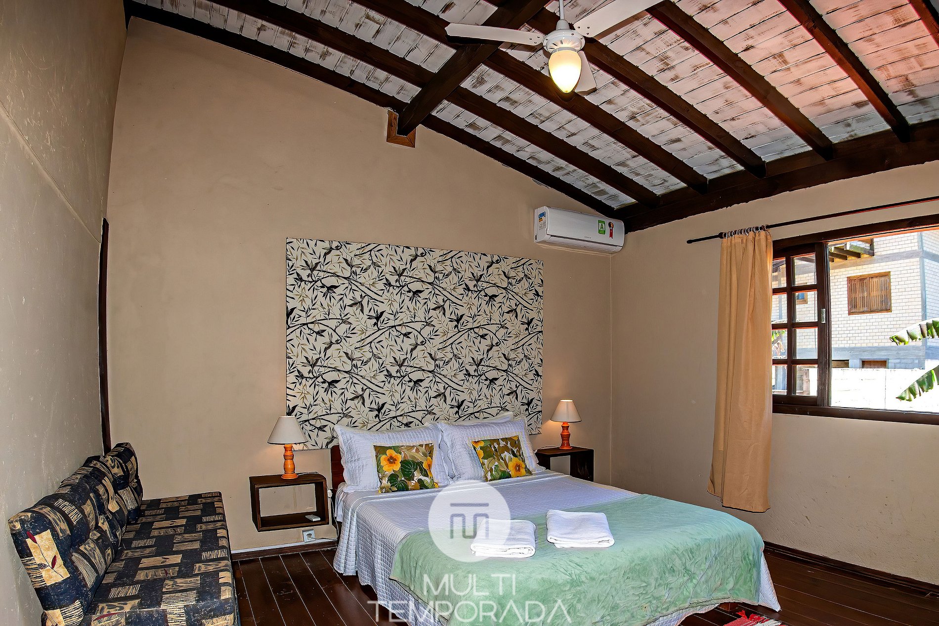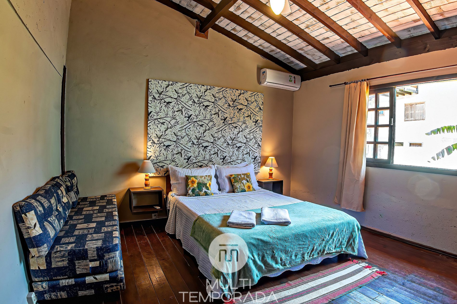 Dormitório: Piso Superior, Cama de Casal e 1 Sofá-Cama de Solteiro, Ar-Condicionado Quente e Frio;