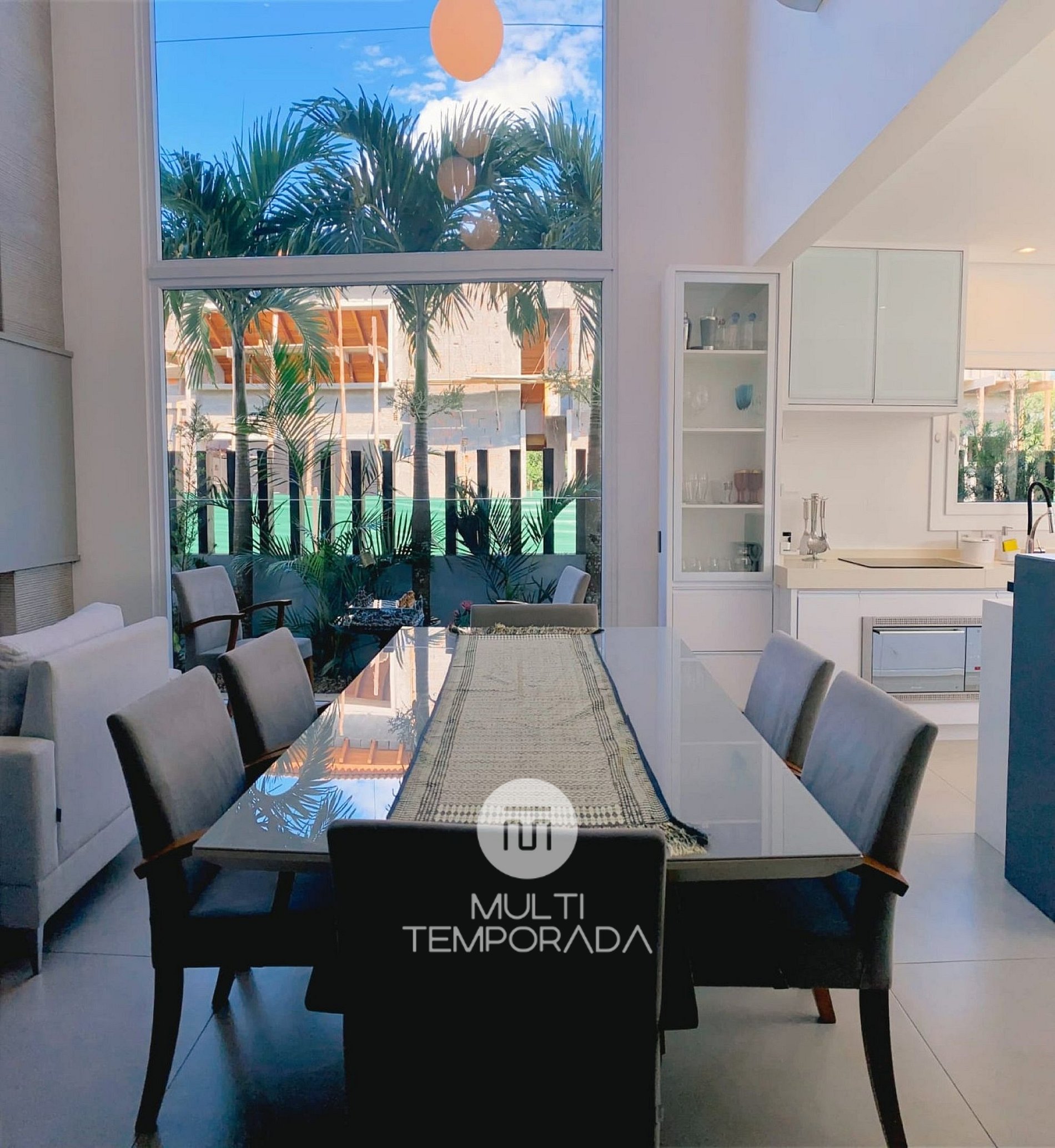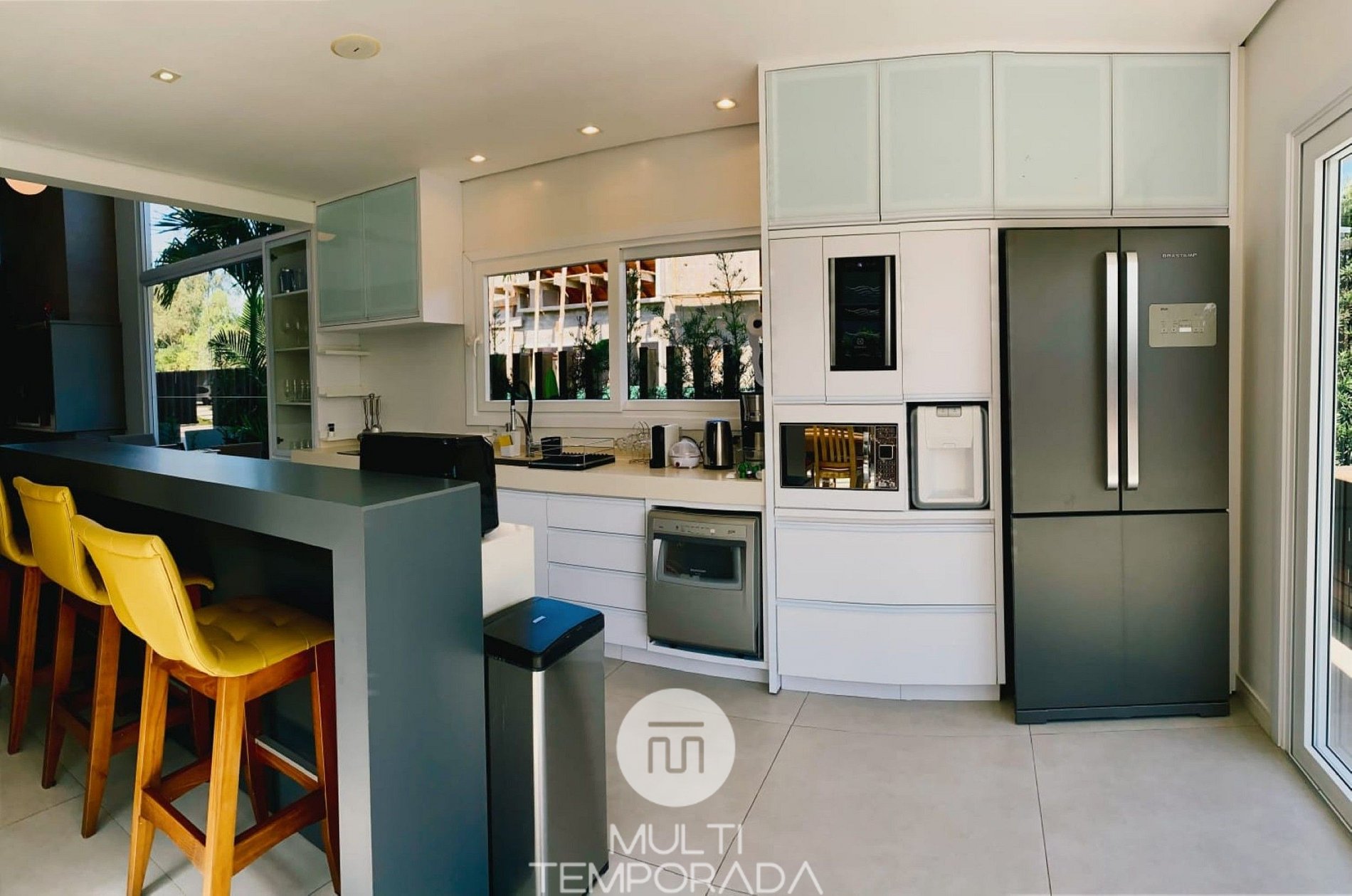 Cozinha: Completa e planejada com churrasqueira, água ionizada, geladeira, freezer, fogão cooktop, forno elétrico, microondas, airfryer, sanduicheira, chaleira elétrica, cafeteira, liquidificador, louças e talheres, taças de vinho e utensílios de cozinha.