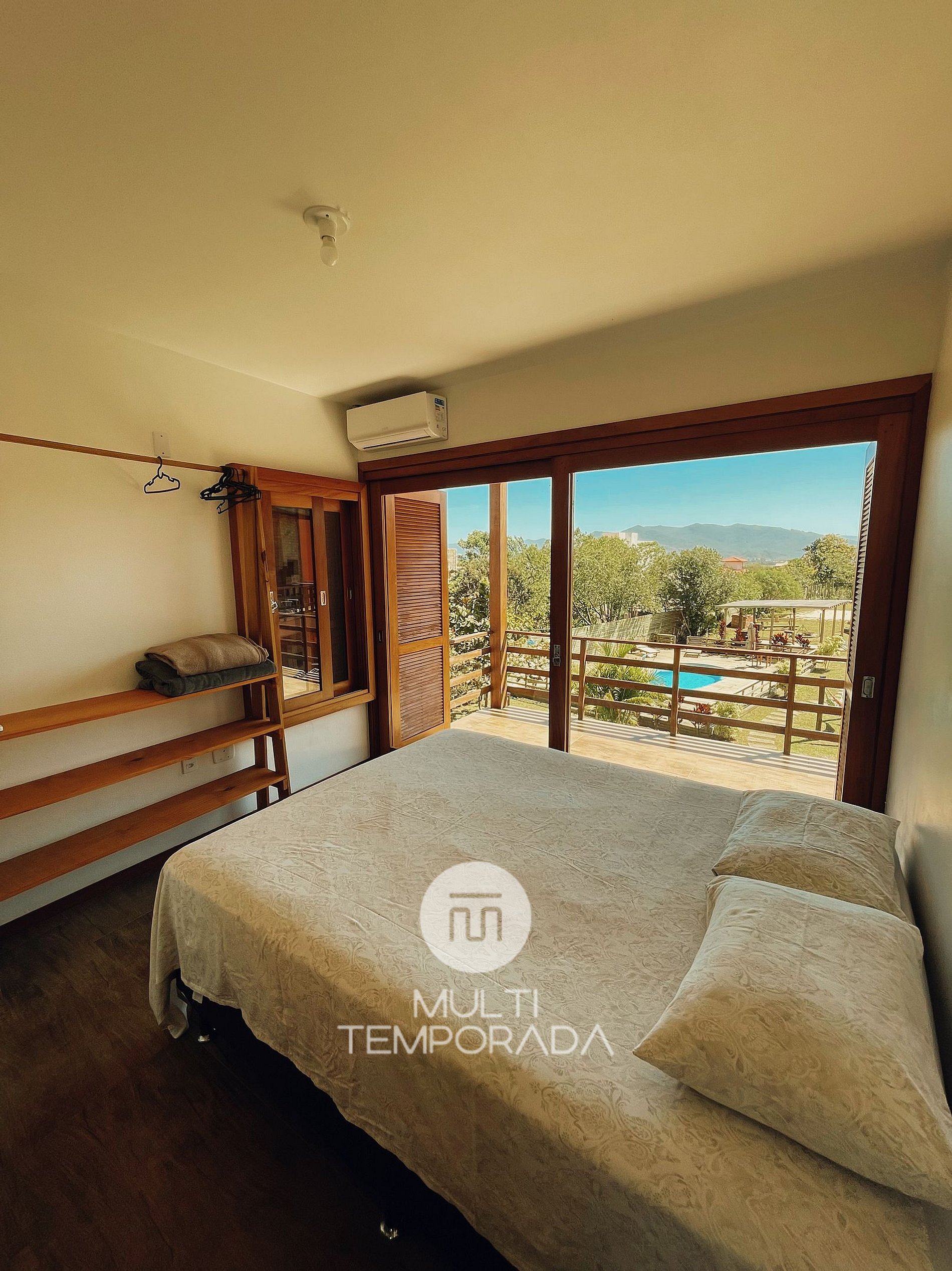 Dormitório 1: Cama Queen, Ar-Condicionado, Arara e Sacada com Vista da Lagoa;