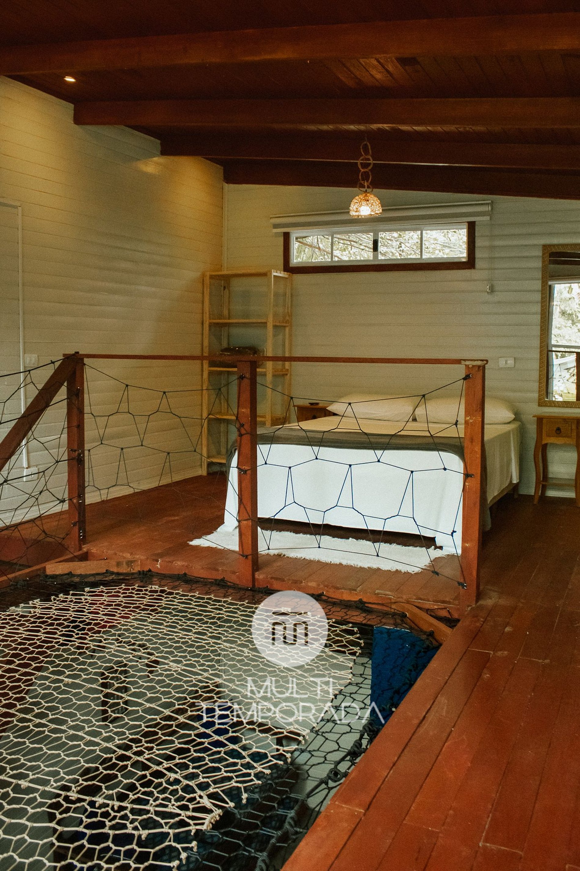 Mezanino: Cama de casal e Rede Suspensa Quadrada com Projetor de TV;