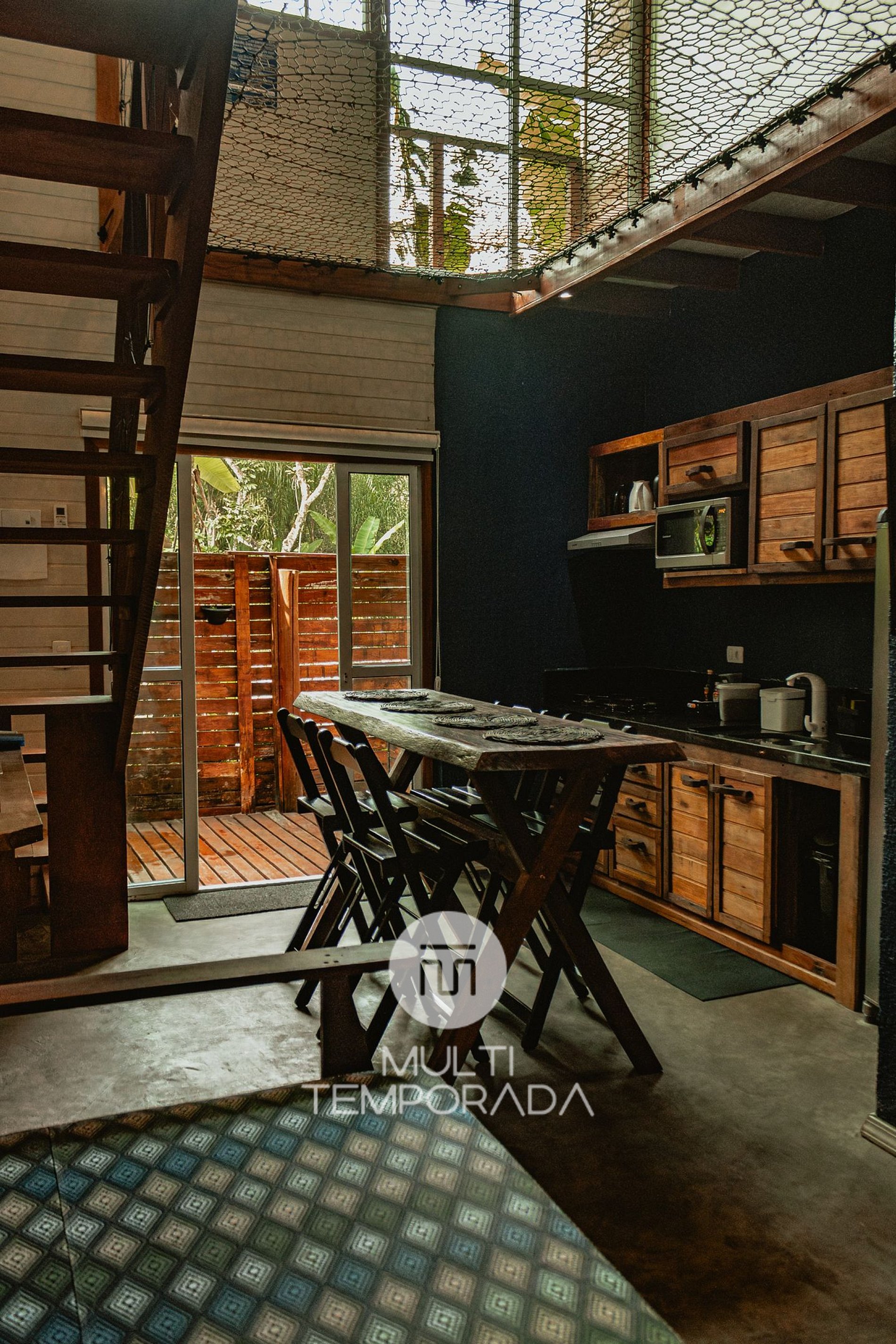 Mezanino: Cama de casal e Rede Suspensa Quadrada com Projetor de TV;