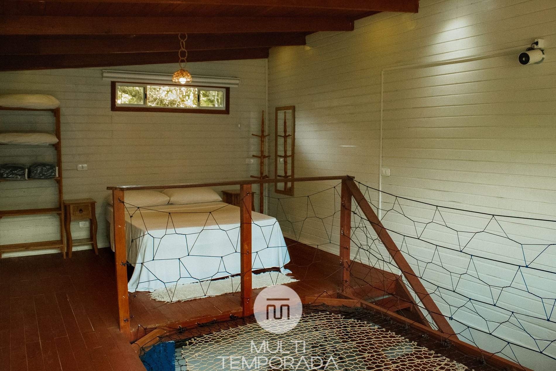 Mezanino: Cama de casal e Rede Suspensa Quadrada com Projetor de TV;