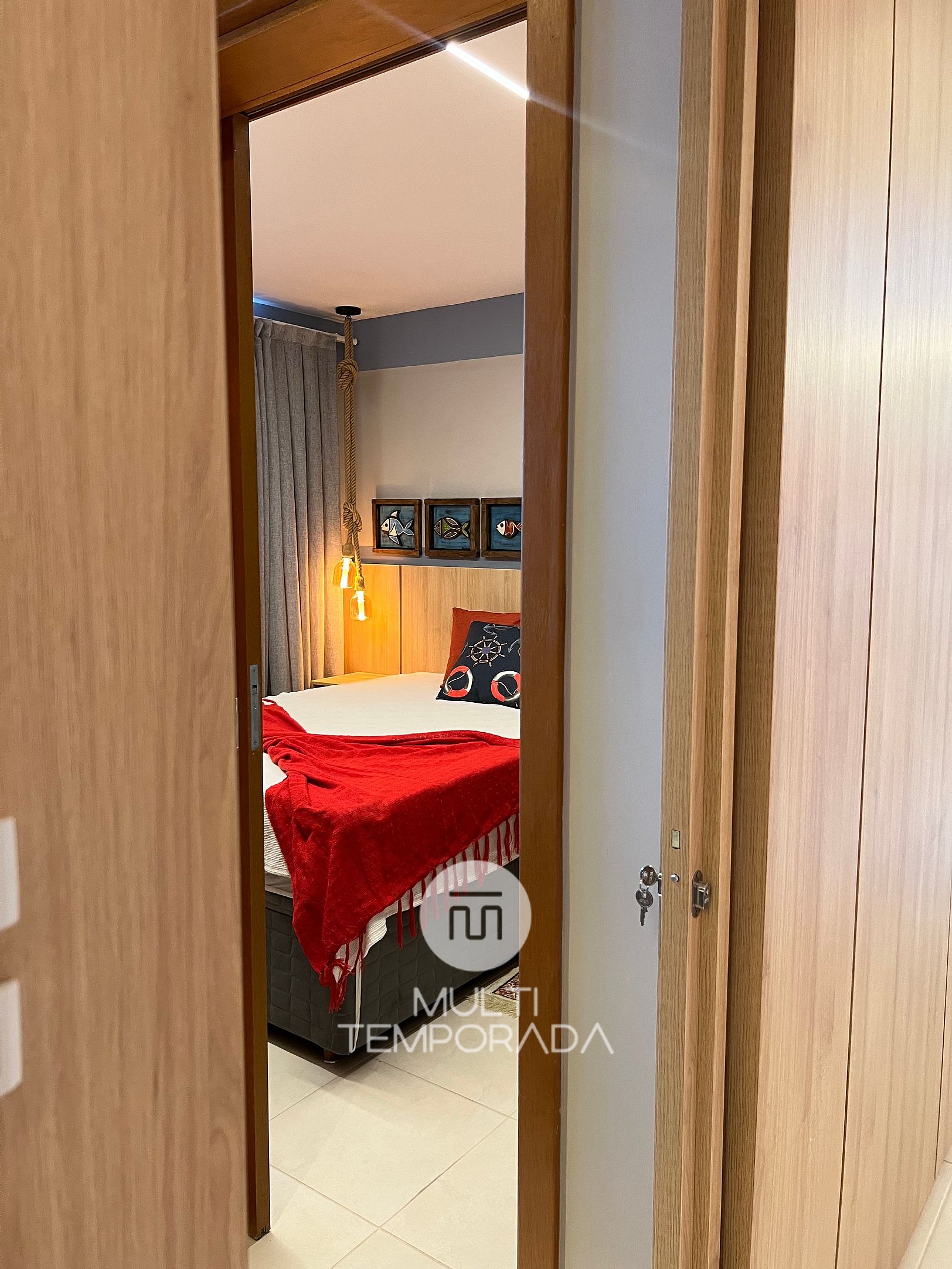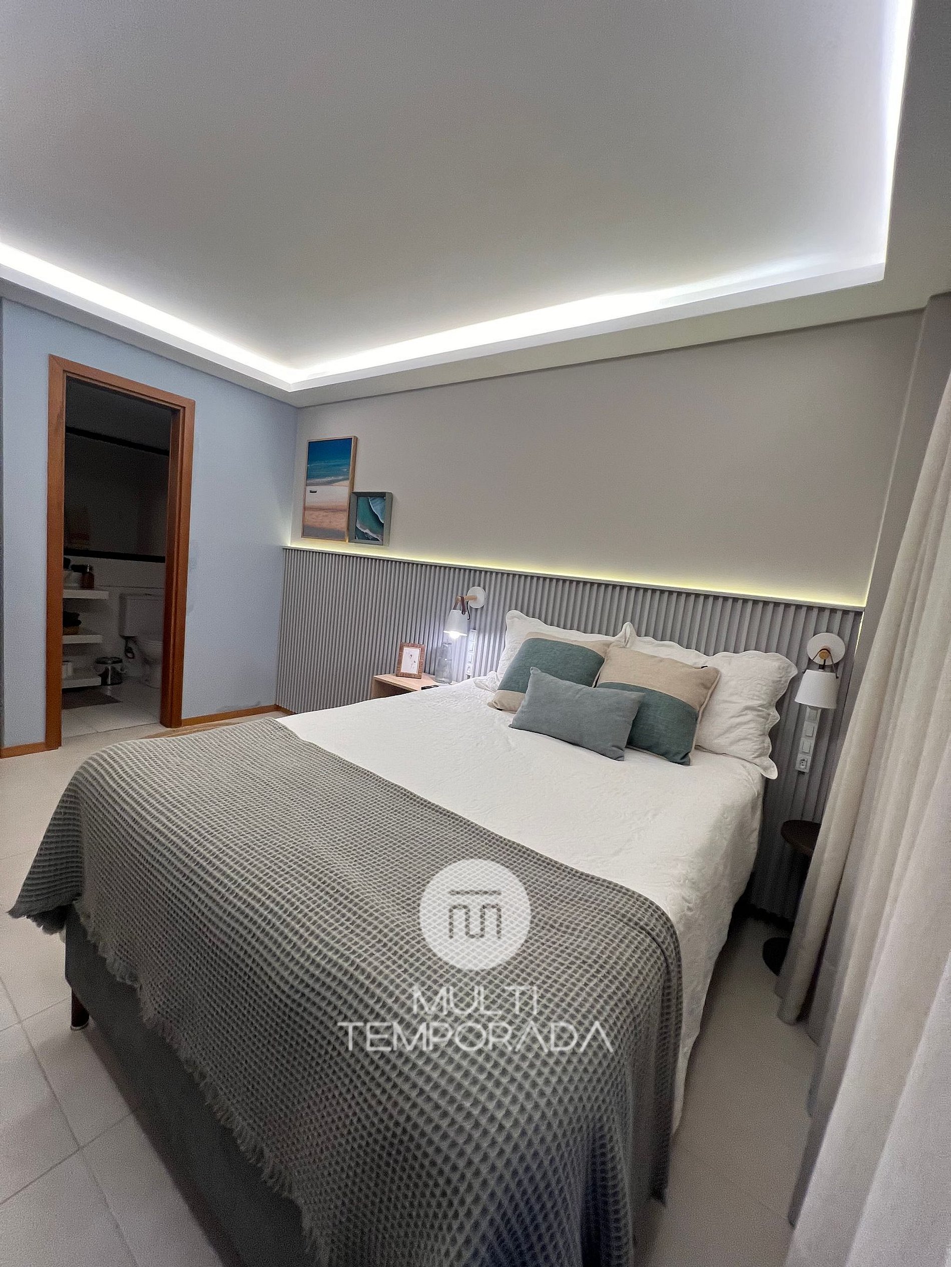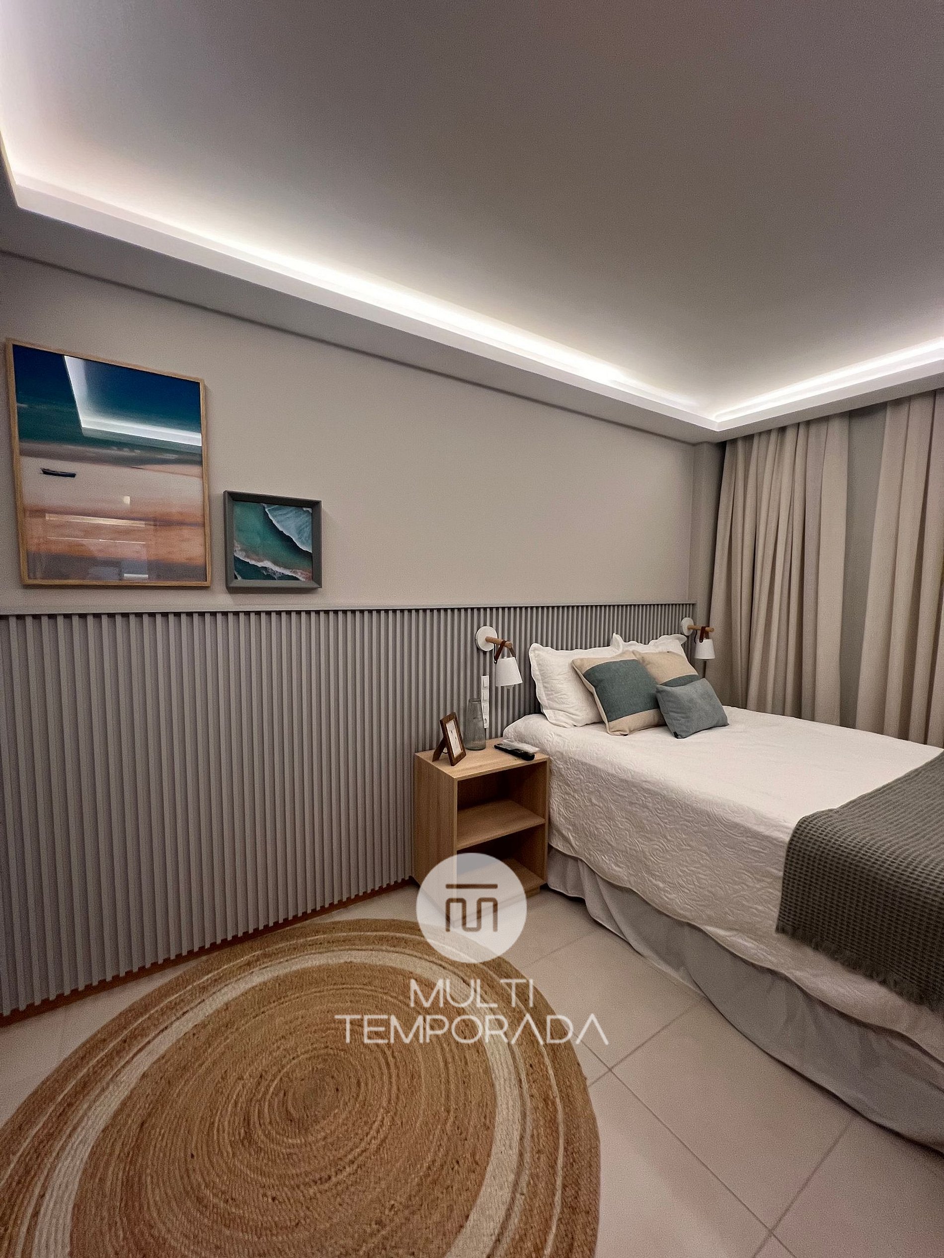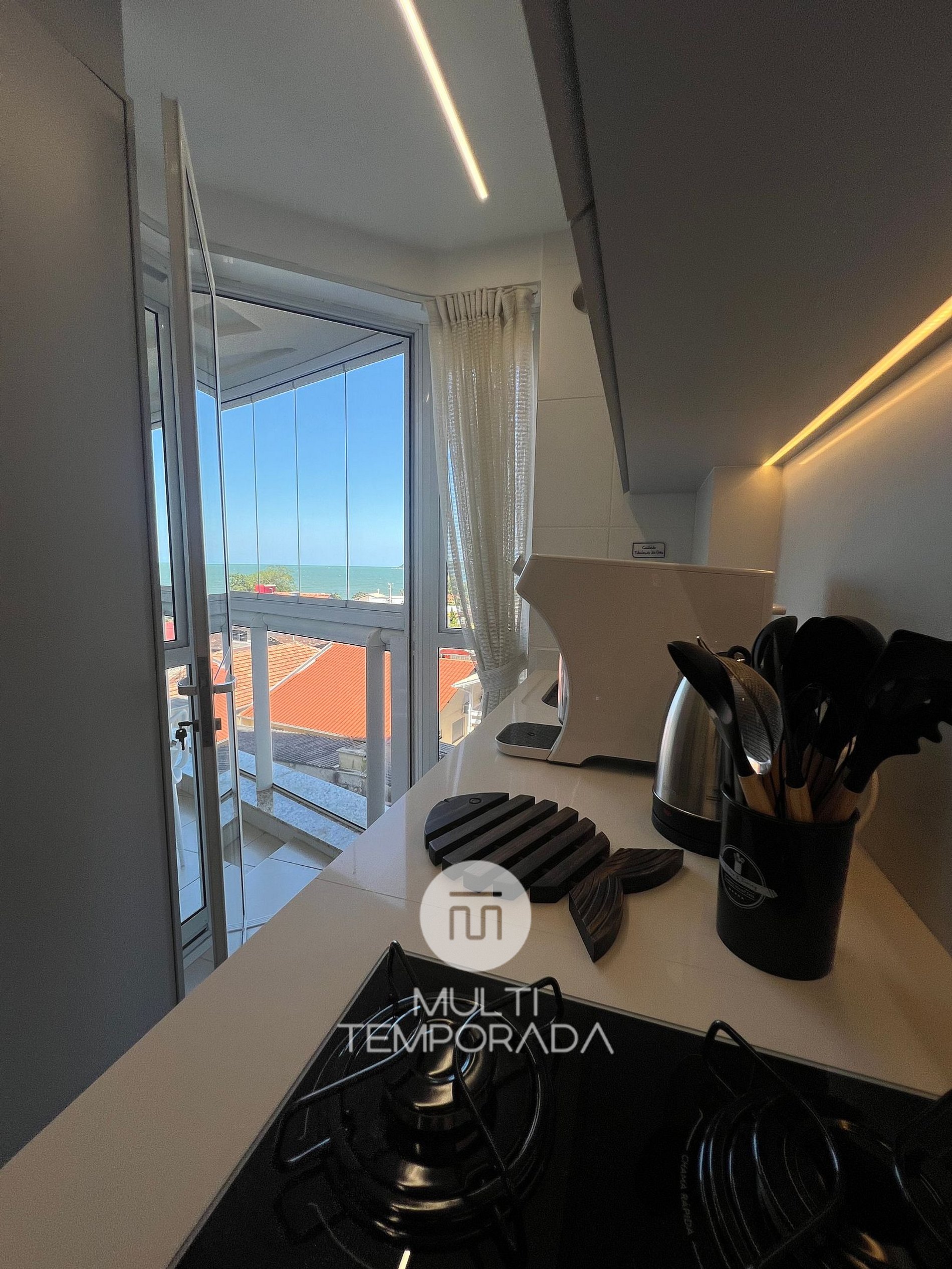 São 70 metros quadrados com varanda com churrasqueira e vista do mar, dois quartos climatizados com vista mar, sendo uma suíte, cozinha e sala climatizada integradas. A cozinha é equipada com fogão, forno, geladeira, microondas, sanduicheira, chaleira elétrica, liquidificador e todos utensílios necessários para fazer uma boa refeição.