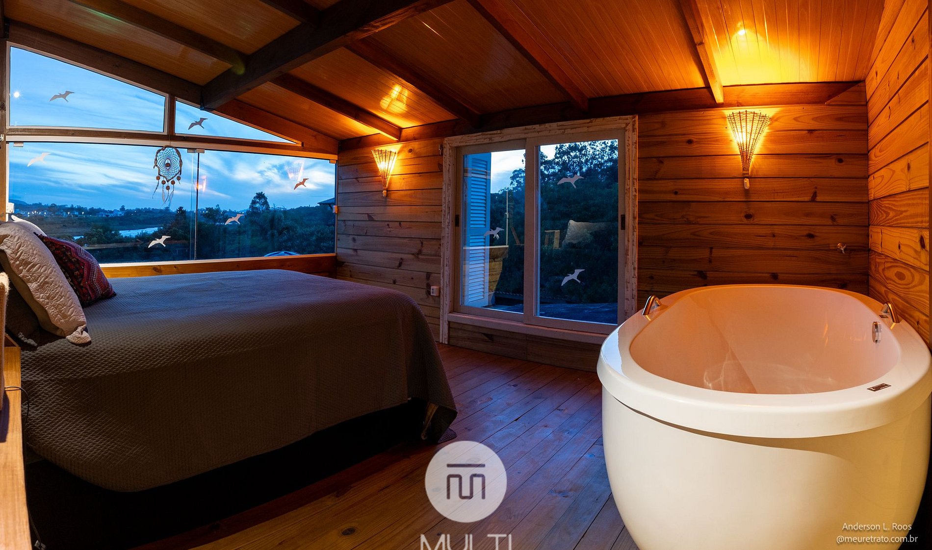 Dormitório 1: Cama de Casal, Banheira de Imersão, Ar-Condicionado Quente e Frio 18mil BTUs e Vista da Lagoa;