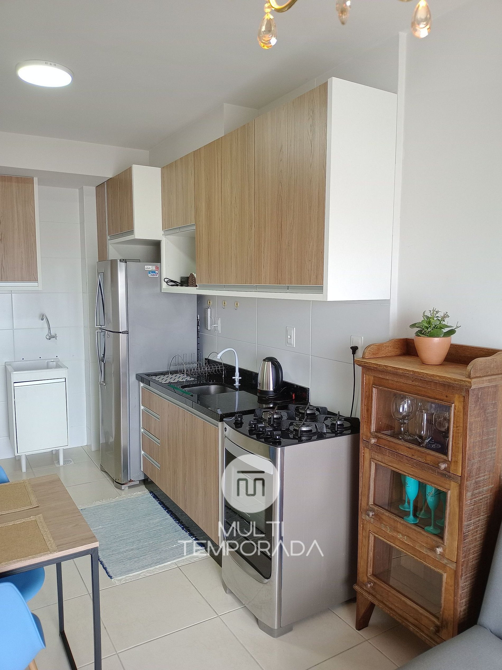 Cozinha: Completa e planejada: geladeira e freezer, fogão, forno, microondas, airfryer, torradeira, louças e talheres e utensílios de cozinha.