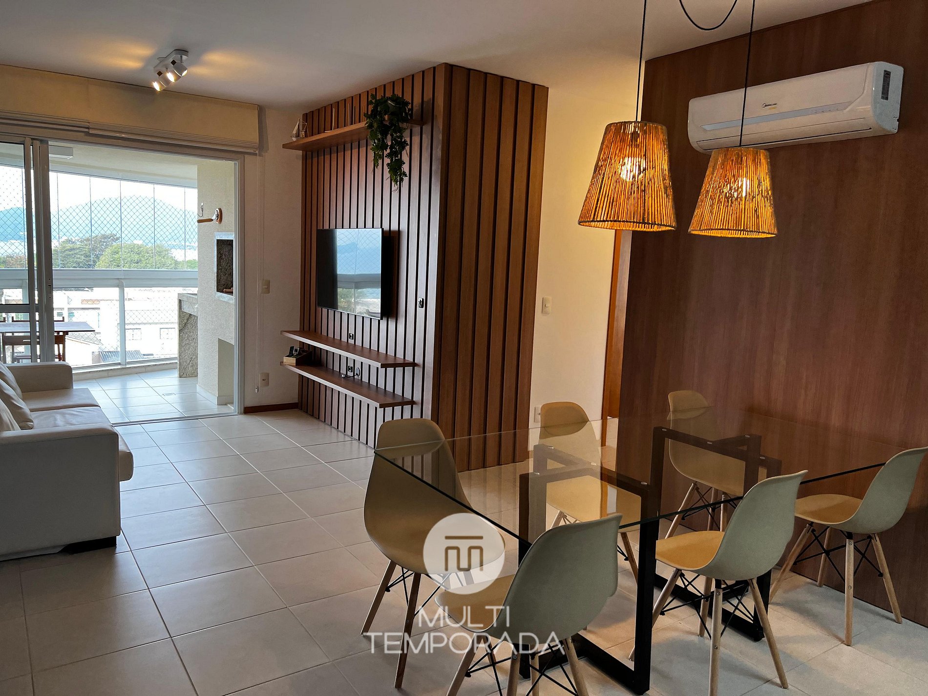 São 90 metros quadrados com varanda com churrasqueira, três quartos climatizados, sendo uma suíte , cozinha e sala integrados com ar-condicionado split também.