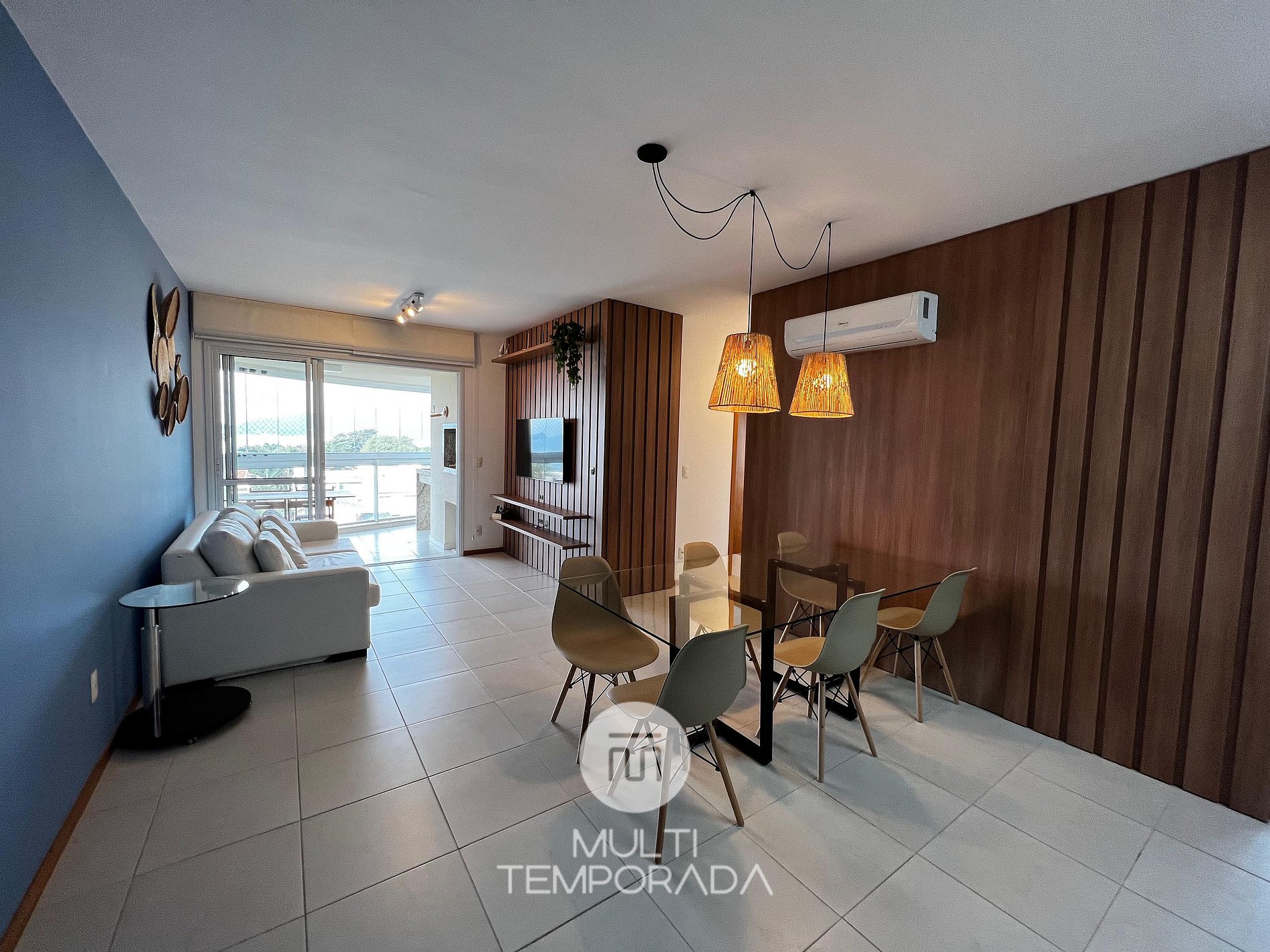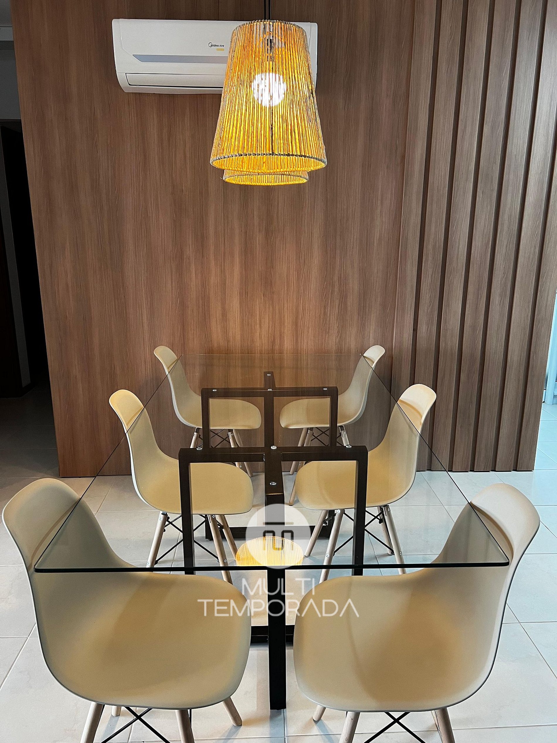 São 90 metros quadrados com varanda com churrasqueira, três quartos climatizados, sendo uma suíte , cozinha e sala integrados com ar-condicionado split também.