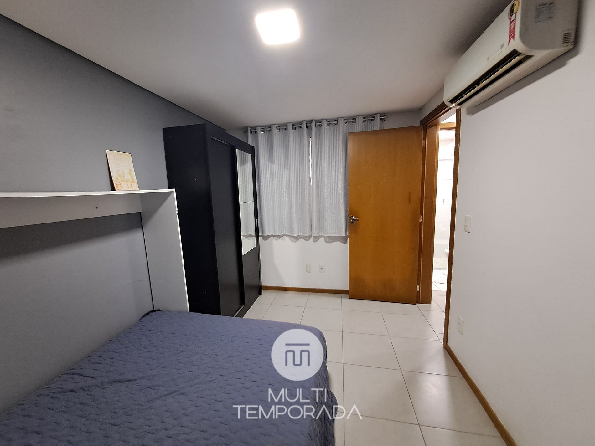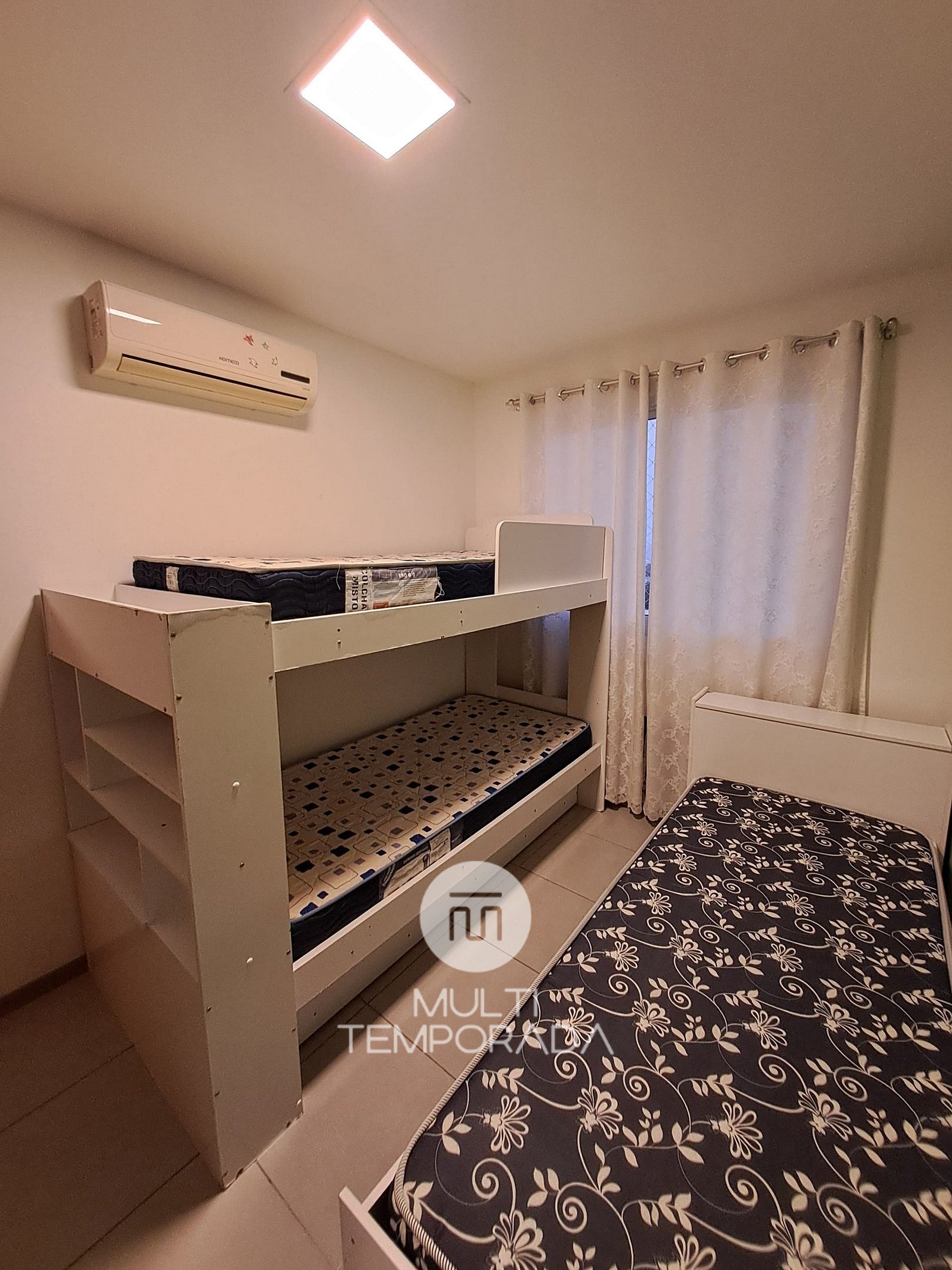 Dormitório 2: Cama de solteiro + Beliche + Ar-condicionado;
