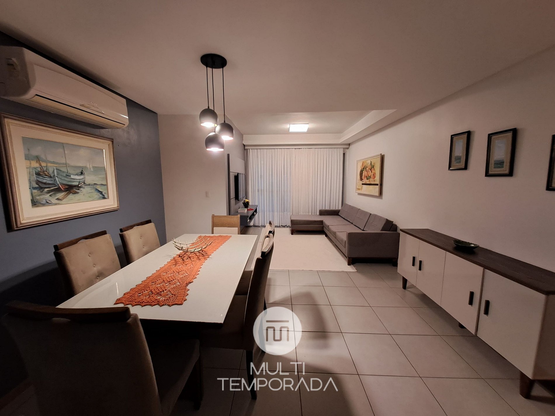 São 88 metros quadrados com varanda com churrasqueira, três quartos climatizados, sendo uma suíte , cozinha e sala integrados com ar-condicionado split também.