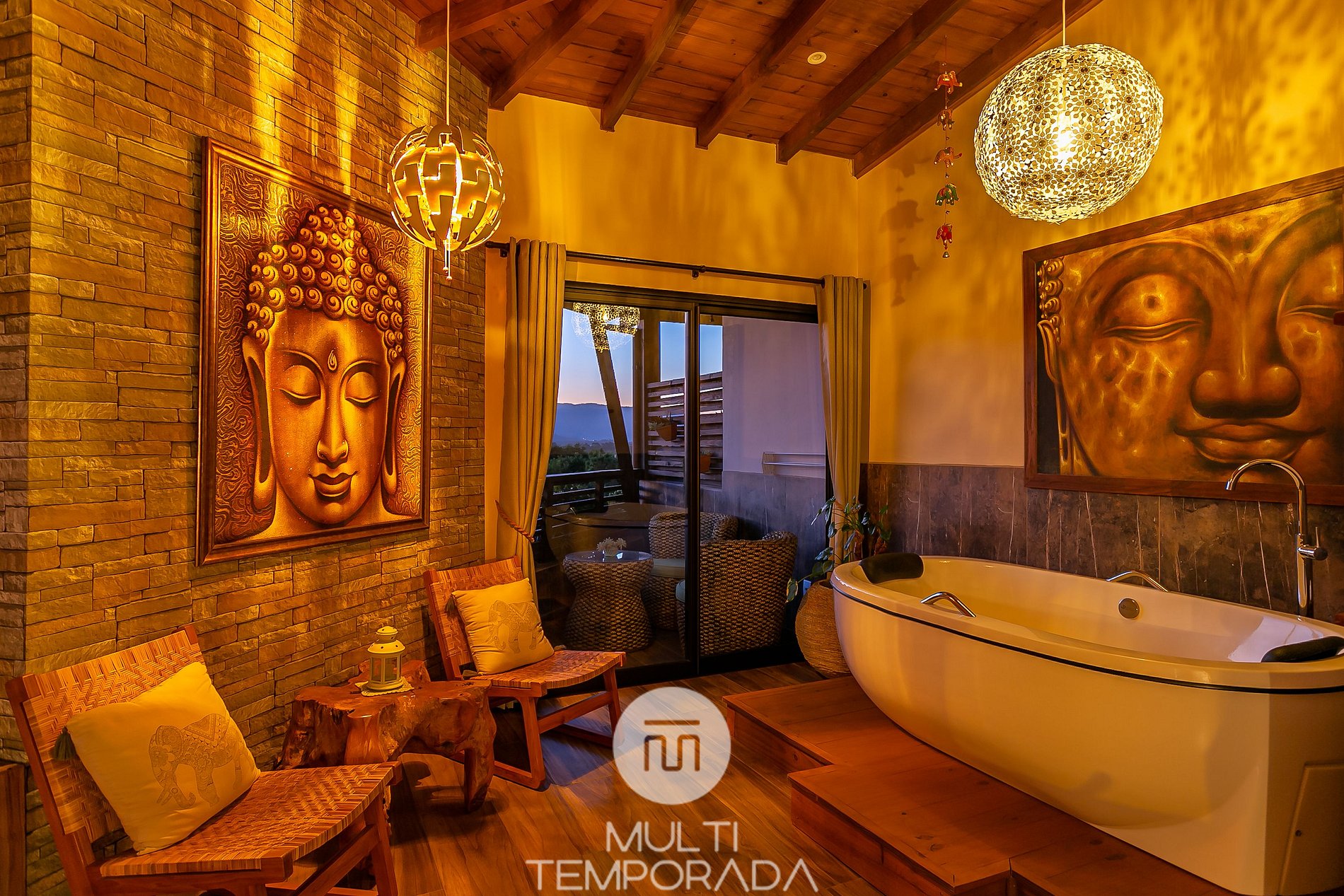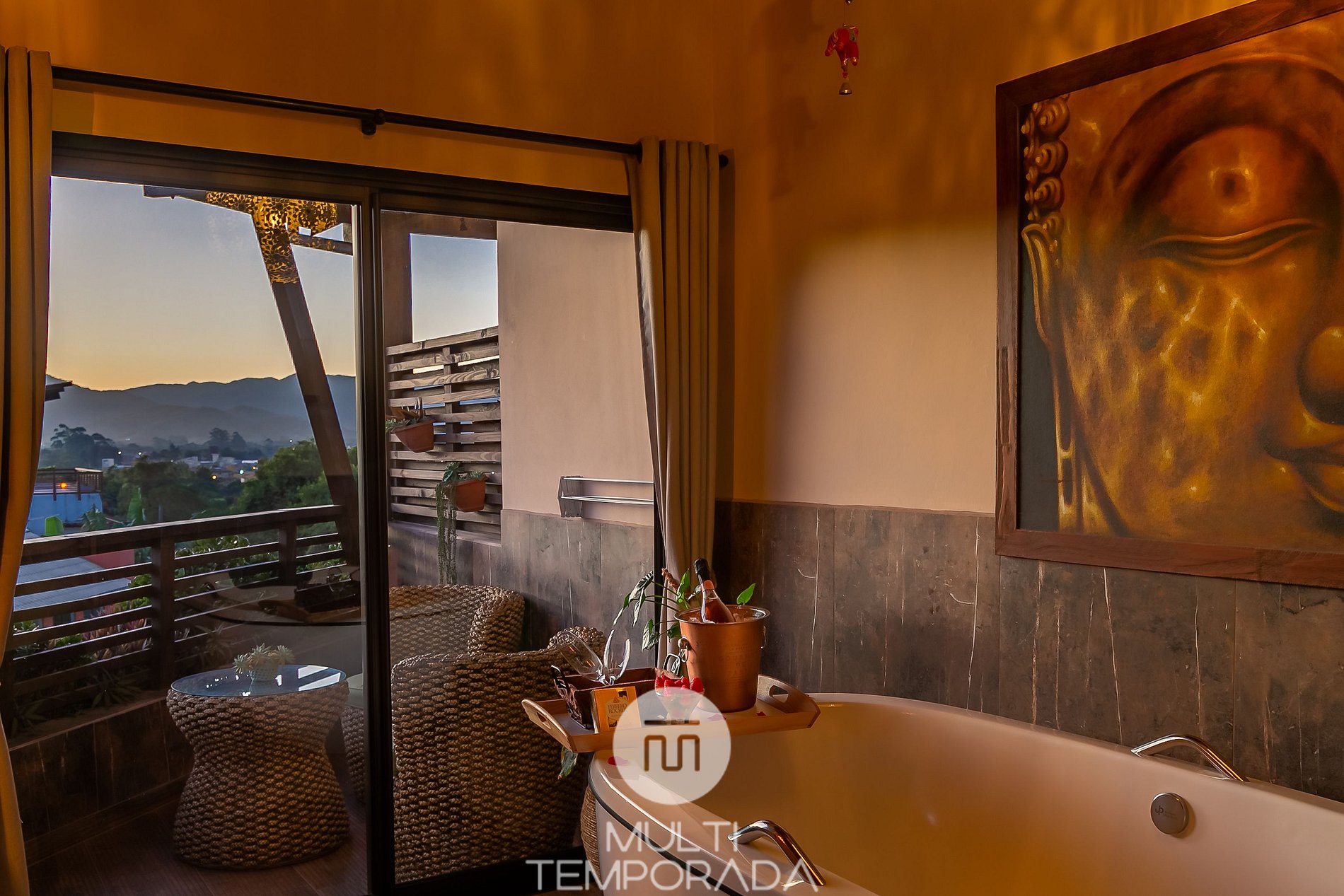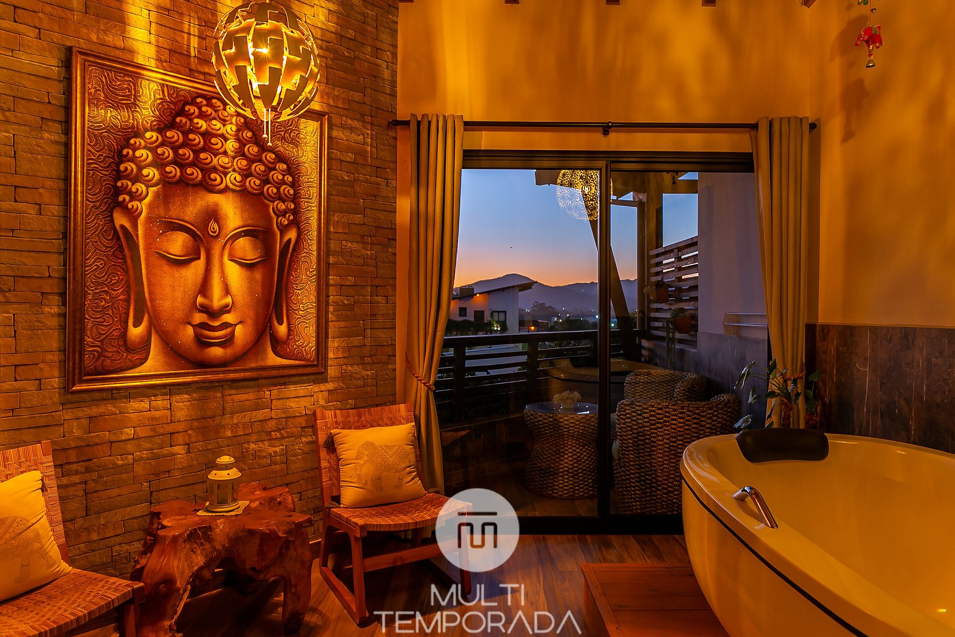Ambiente zen, inspirado no Budismo e Hinduísmo, com um belíssimo jardim perfeito para relaxar, terraço panorâmico com vista privilegiada do pôr-do-sol e itens decorativos importados da Indonésia!
