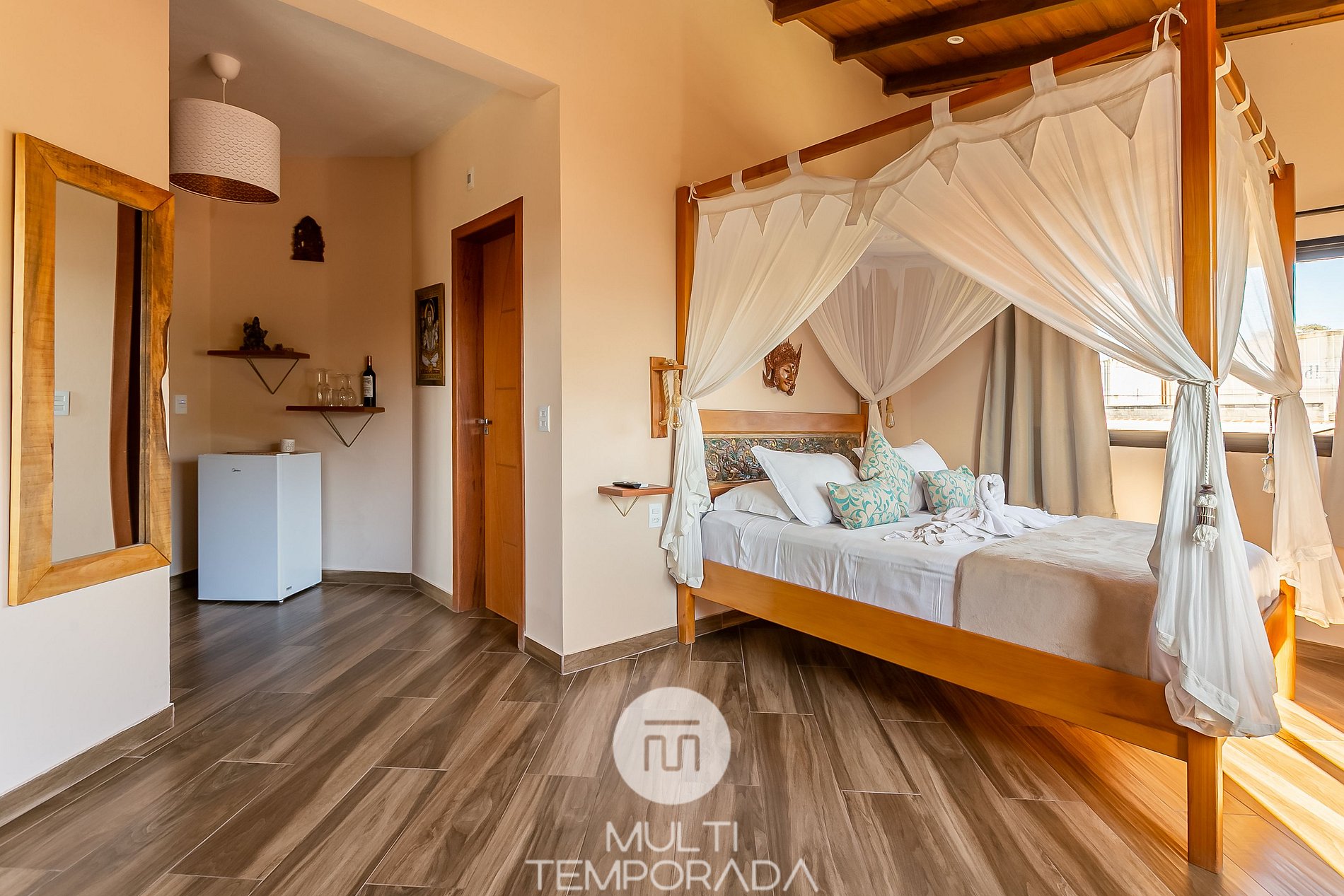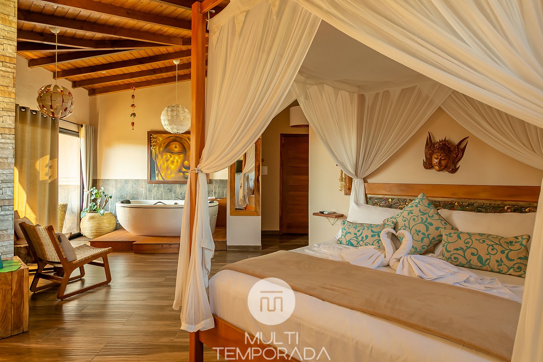 Belíssimas suítes de luxo para casal em um hotel boutique, totalmente novo, localizado a 120 metros do centrinho do Rosa! Ambiente zen, inspirado no Budismo e Hinduísmo, com um belíssimo jardim perfeito para relaxar, terraço panorâmico com vista privilegiada do pôr-do-sol e itens decorativos importados da Indonésia! Café da manhã com ingredientes orgânicos e coloniais, feito com muito amor! Apenas 900 metros até o Rosa Norte!