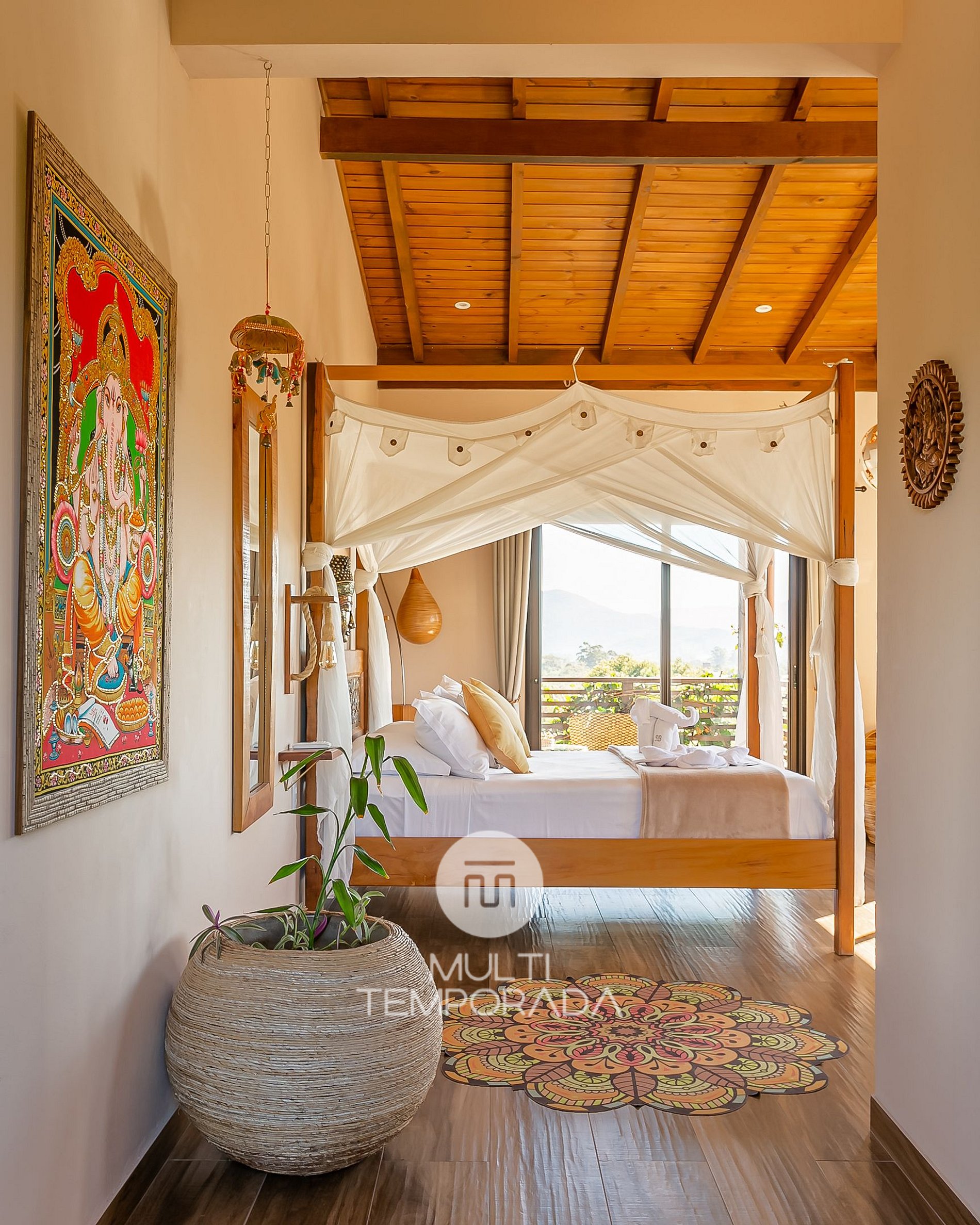A Suíte Ganesh é ampla (34m²), em piso superior, confortável e climatizada. Possui cama queen-size, banheira de imersão, armário, varanda com vista da montanha e frigobar com produtos de alto padrão à disposição, garantindo maior praticidade e bem-estar aos hóspedes;