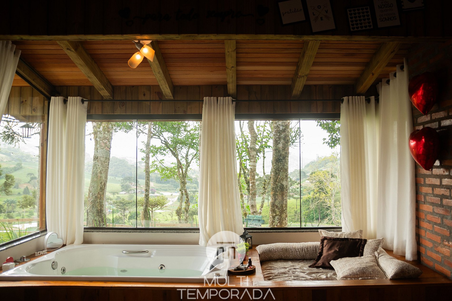 O espaço interno possui 40m². Oferecemos estacionamento amplo. A estrutura interna oferece jacuzzi com hidromassagem, lareira à lenha, ambiente todo climatizado com ar-condicionado quente e frio e uma vista maravilhosa da natureza, estando em qualquer parte do chalé. A cozinha é completa e possui: fogão cooktop, forno elétrico 21L, geladeira, micro-ondas, máquina de fondue, cafeteira, sanduicheira, louças e talheres, taças de vinho e itens básicos de cozinha, bem como eletrodomésticos de primeira linha. Além disso, temos internet WI-FI de 70 mega, TV Smart 32’’ com serviço de streaming Netflix, rouparia de cama e banho, cobertores e travesseiros, secador de cabelo e tudo o que há de melhor para sua hospedagem. O terreno é imenso e cheio de verde com um balanço fantástico, vista para as montanhas e acesso a três lagos. Tudo isso para um melhor conforto dos nossos hóspedes, para que se sintam em casa, em um perfeito refúgio para descansar e desvendar o que há de melhor na Serra Catarinense.