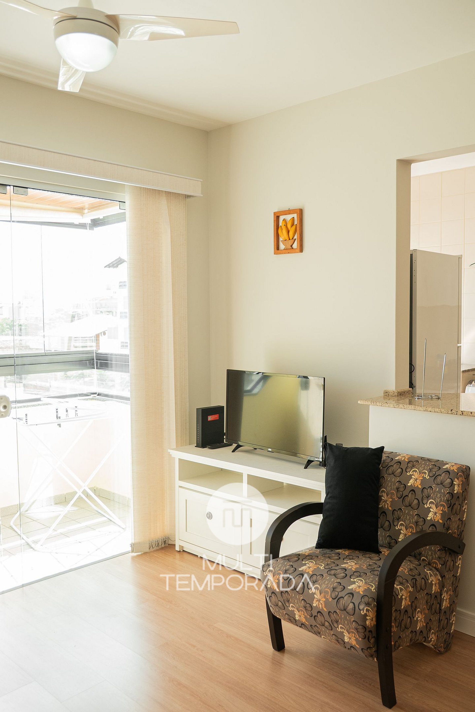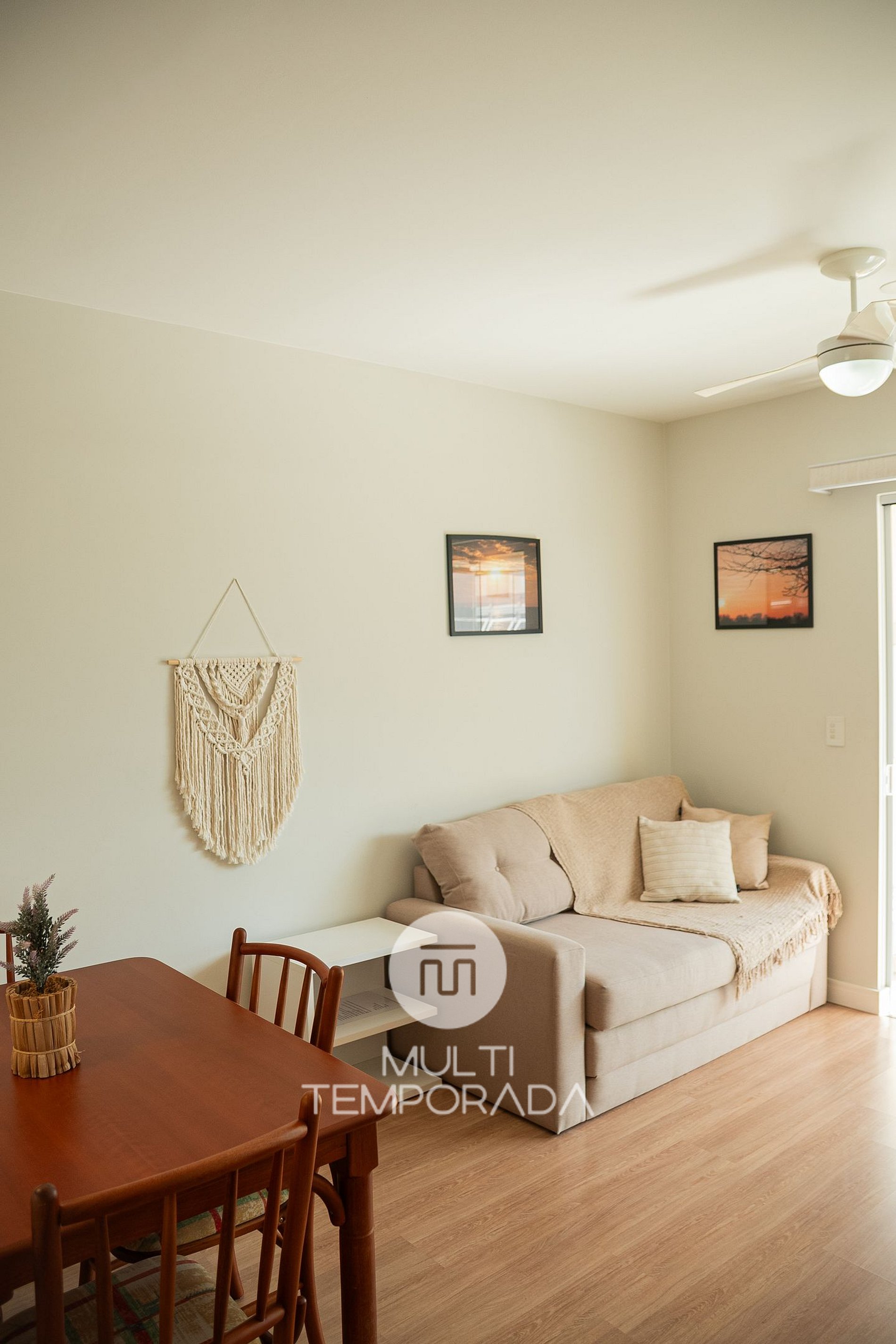 Sala de Estar: Sofá-cama de casal, TV Smart de 50 polegadas, ventilador de teto, cadeiras e mesa;