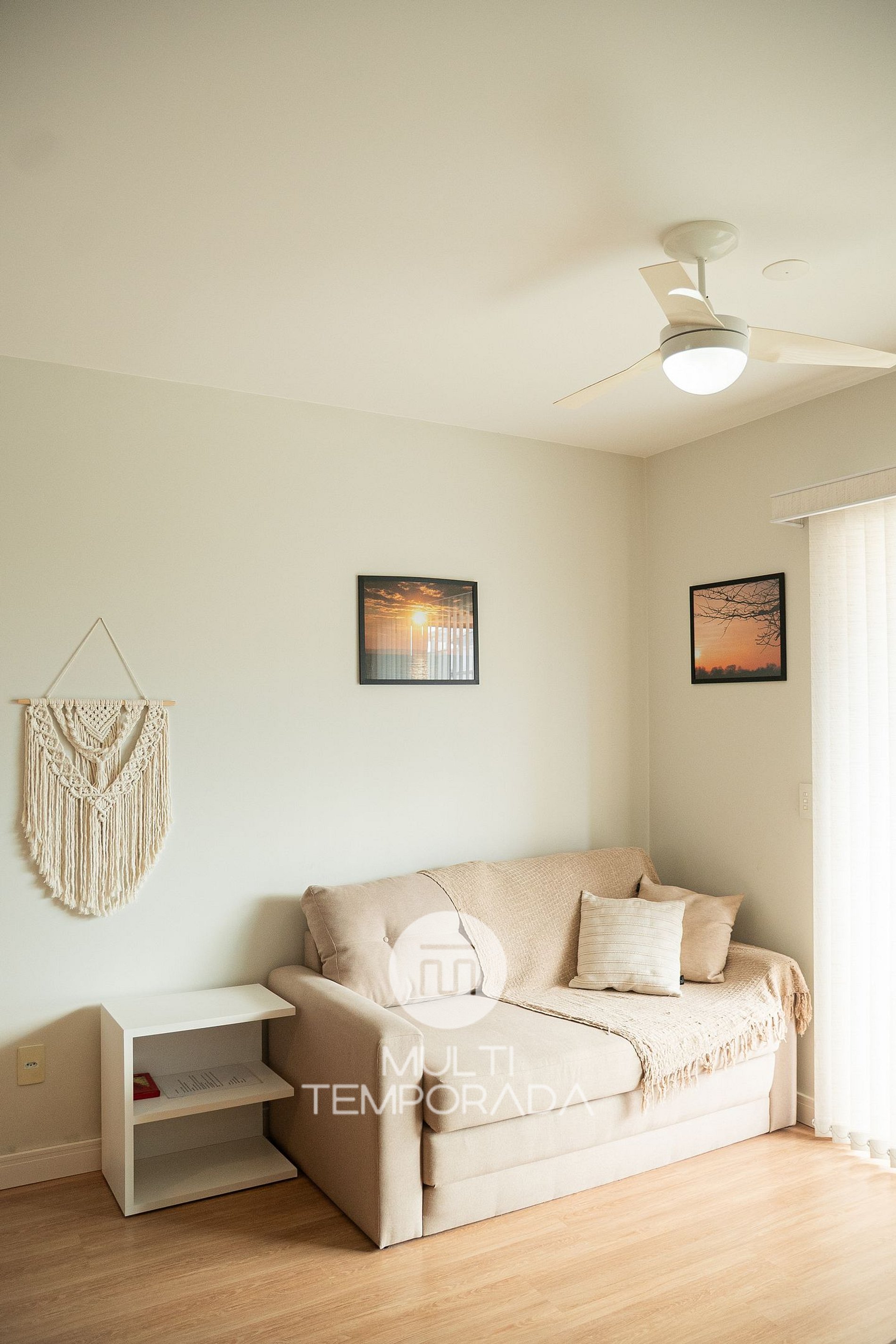 Sala de Estar: Sofá-cama de casal, TV Smart de 50 polegadas, ventilador de teto, cadeiras e mesa;
