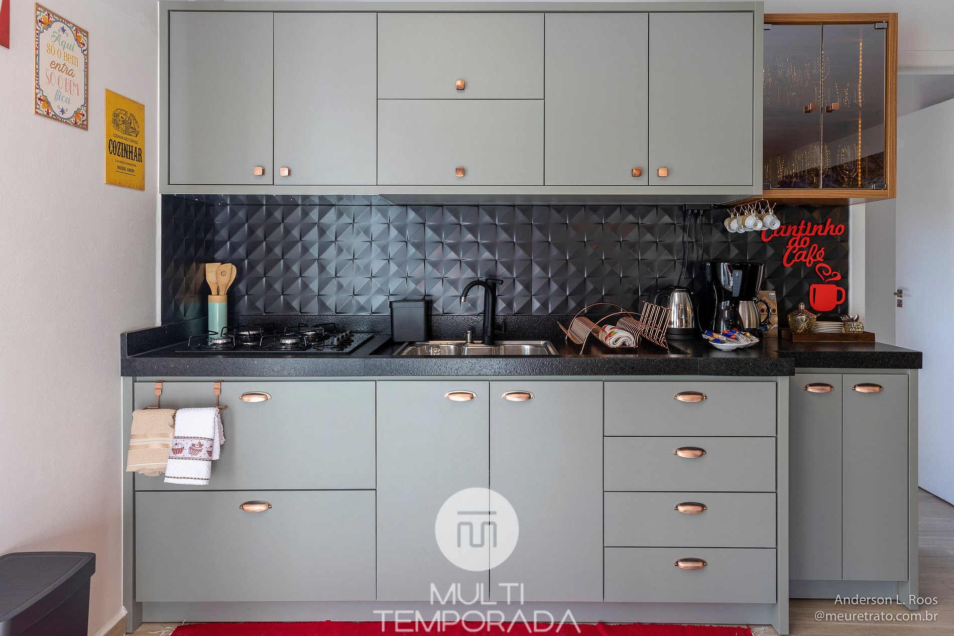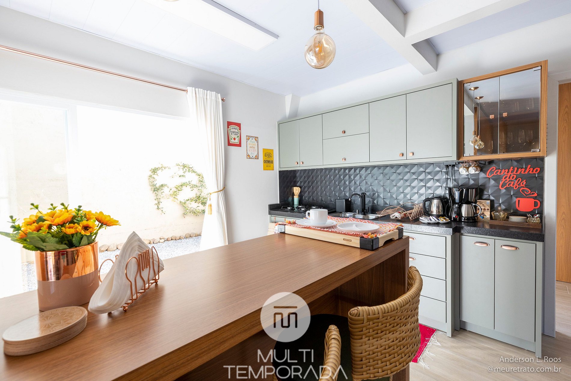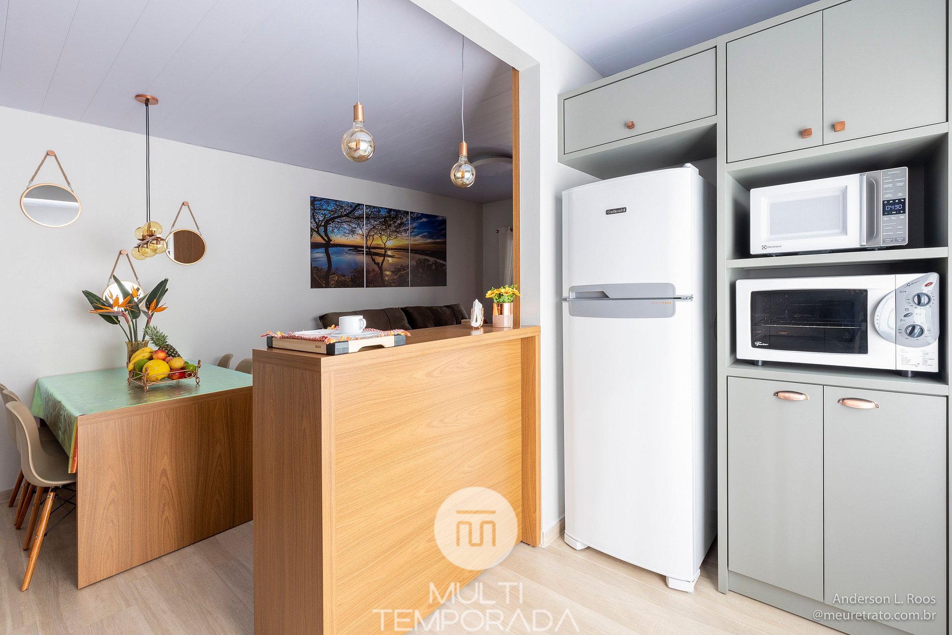 A cozinha planejada possui: geladeira duplex, freezer vertical, fogão cooktop, forno elétrico, micro-ondas, airfryer, sanduicheira, torradeira, cafeteira, batedeira, chaleira elétrica, espremedor de frutas, purificador de água, louças e talheres, copos e taças e utensílios de cozinha completos.