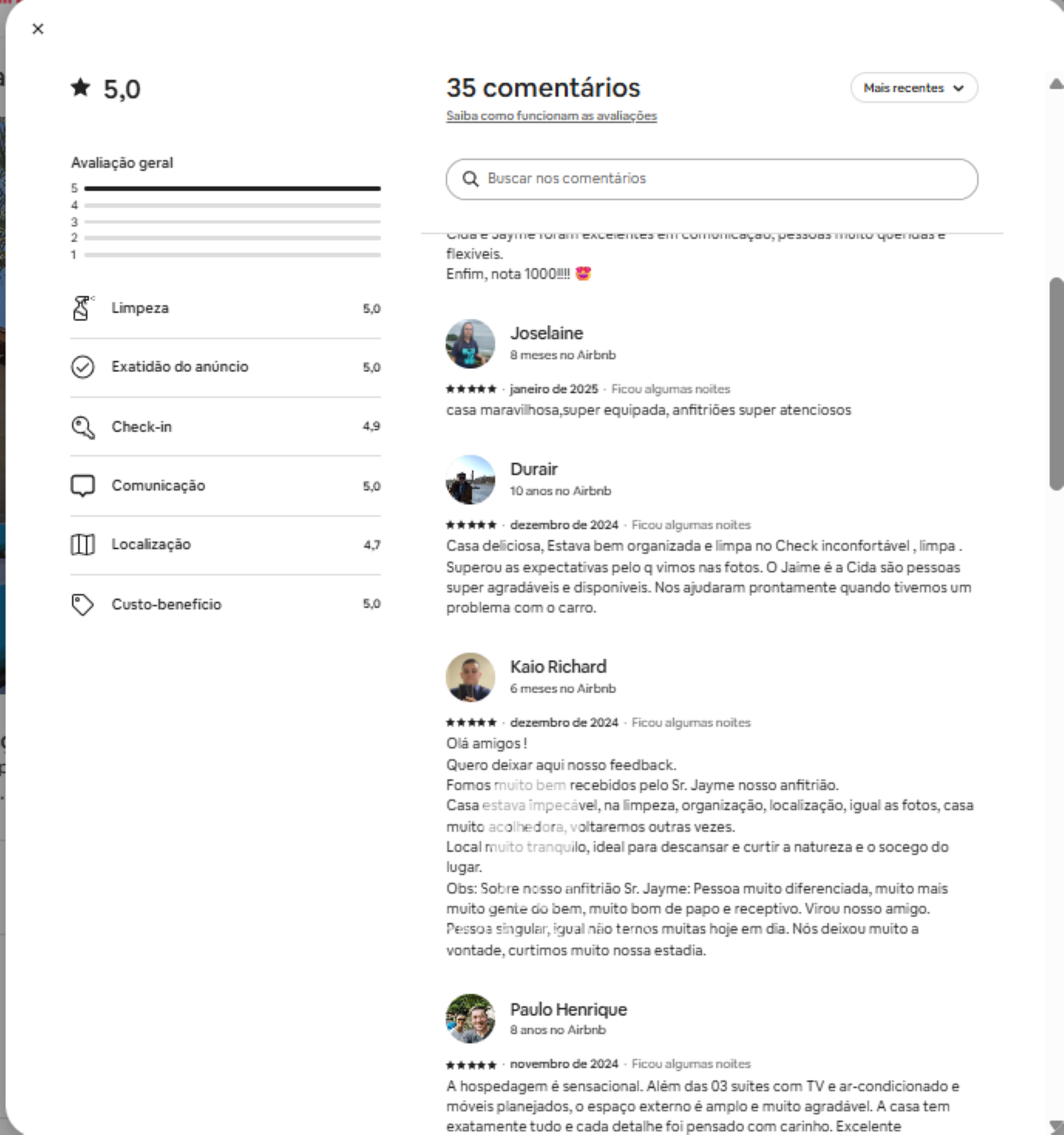 Olá amigos ! Quero deixar aqui nosso feedback. Fomos muito bem recebidos pelo Sr. Jayme nosso anfitrião. Casa estava impecável, na limpeza, organização, localização, igual as fotos, casa muito acolhedora, voltaremos outras vezes. Local muito tranquilo, ideal para descansar e curtir a natureza e o socego do lugar. Obs: Sobre nosso anfitrião Sr. Jayme: Pessoa muito diferenciada, muito mais muito gente do bem, muito bom de papo e receptivo. Virou nosso amigo. Pessoa singular, igual não temos muitas hoje em dia. Nós deixou muito a vontade, curtimos muito nossa estadia.