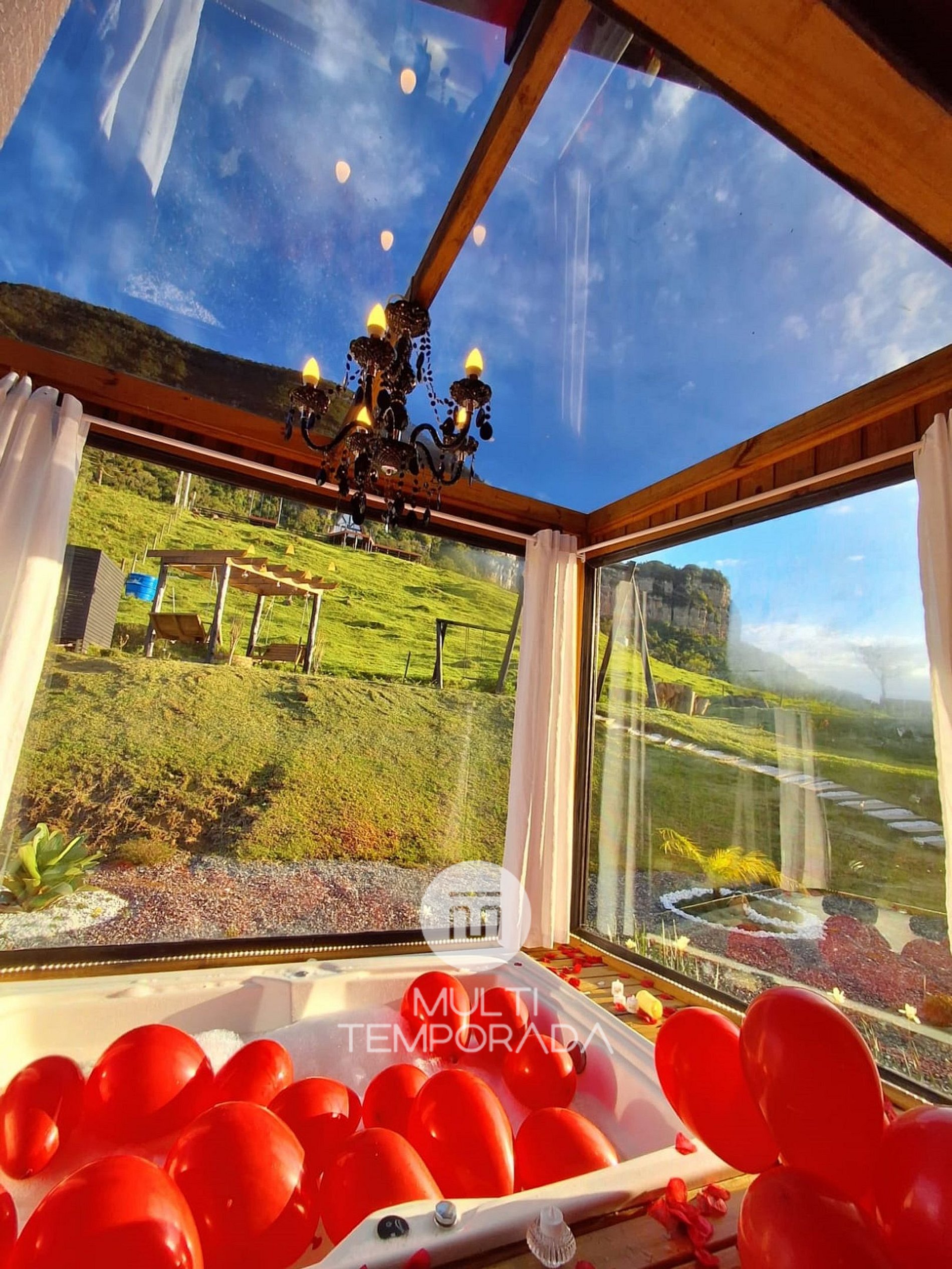 A Multitemporada apresenta o Refúgio Master com Banheira na Serra da Tartaruga, pertencente ao município de Alfredo Wagner/SC, um espaço aconchegante e agradável, perfeito para encontros familiares e com amigos. A propriedade tem como destaque a sua localização e vista, ficando em uma região montanhosa (serra), clima agradável, rodeado pela natureza e com uma vista exuberante para o pôr-do-sol.