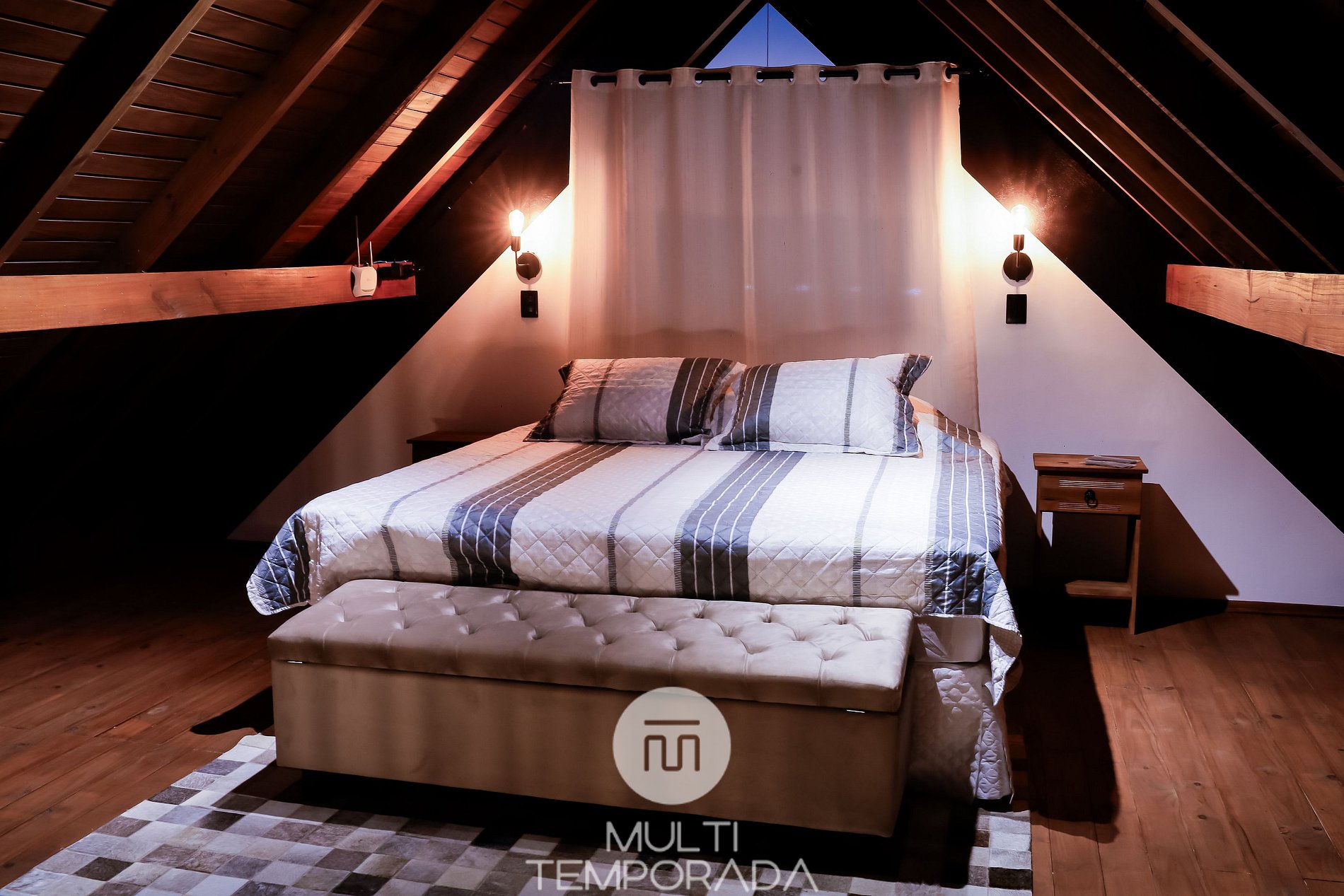 A Chalé Entre as Nuvens possui 64m² e dispõem de 1 dormitório, um mezanino, sala de estar, sala de jantar, cozinha completa e 1 banheiro social completo com chuveiro. A capacidade vai até 4 hóspedes com máximo de conforto;
