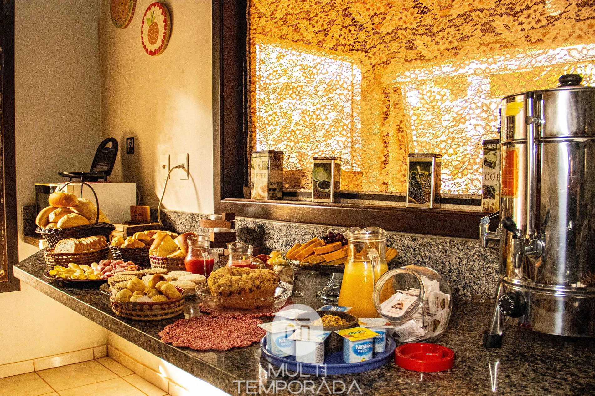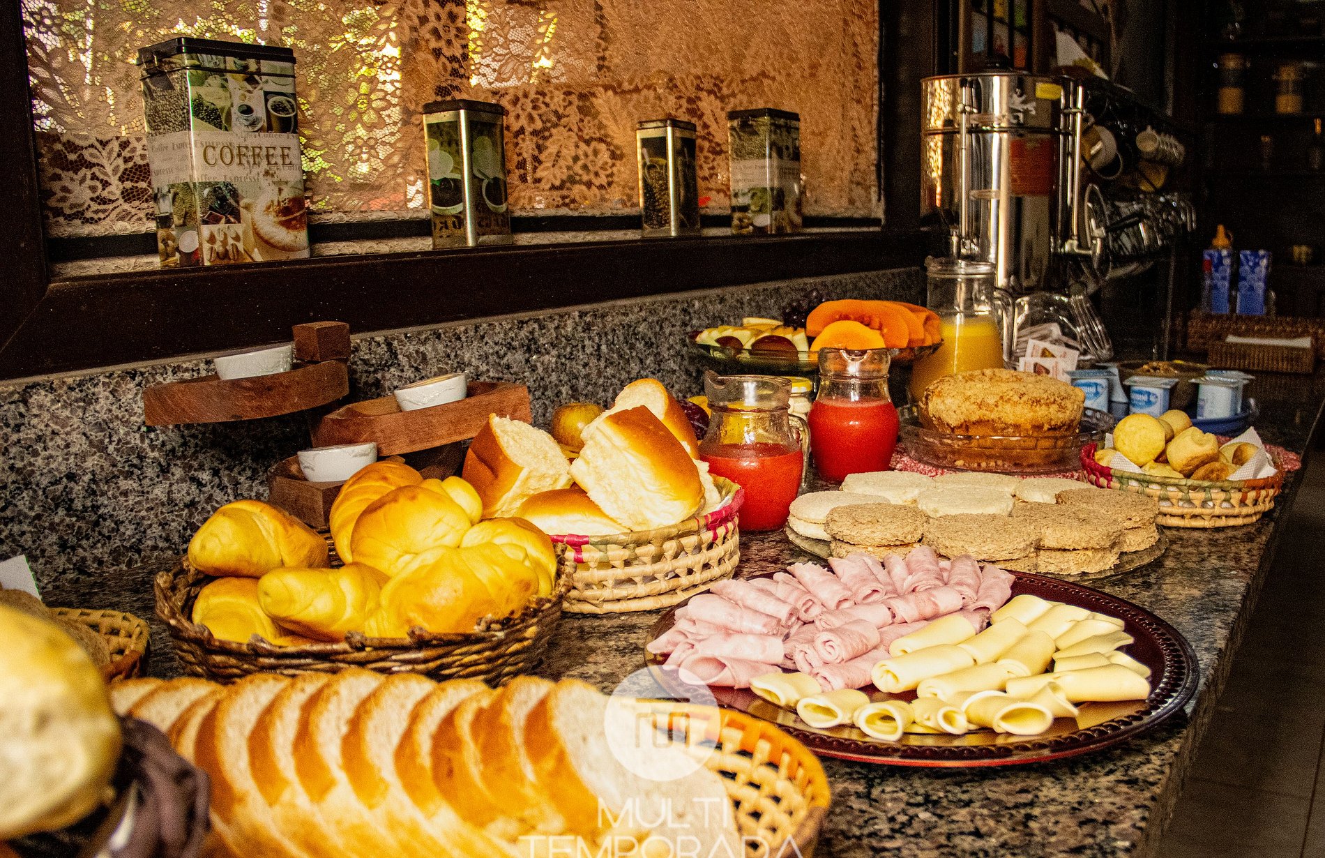 Café da Manhã: Café, suco, água, leite, achocolatado, chá, manteiga, queijo e presunto, pães, sanduiche e bolo para você começar a sua manhã!