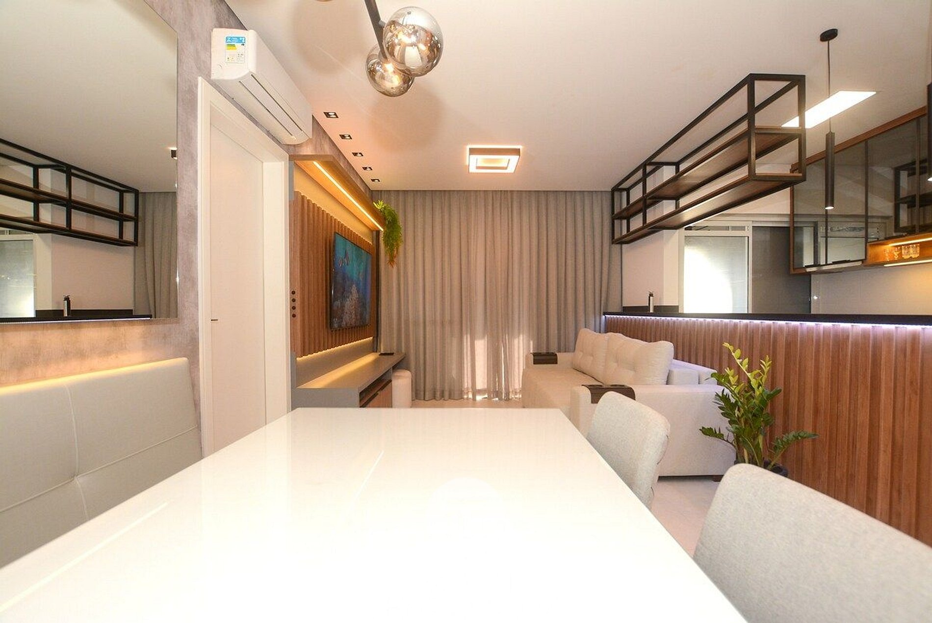 O apartamento é novo, possui 77m² e tem como destaque sua arquitetura. São 92 metros quadrados com sacada com churrasqueira, adega e cervejeira, dois dormitórios climatizados, sendo uma suíte, cozinha completa, sala de estar/jantar e banheiro social.