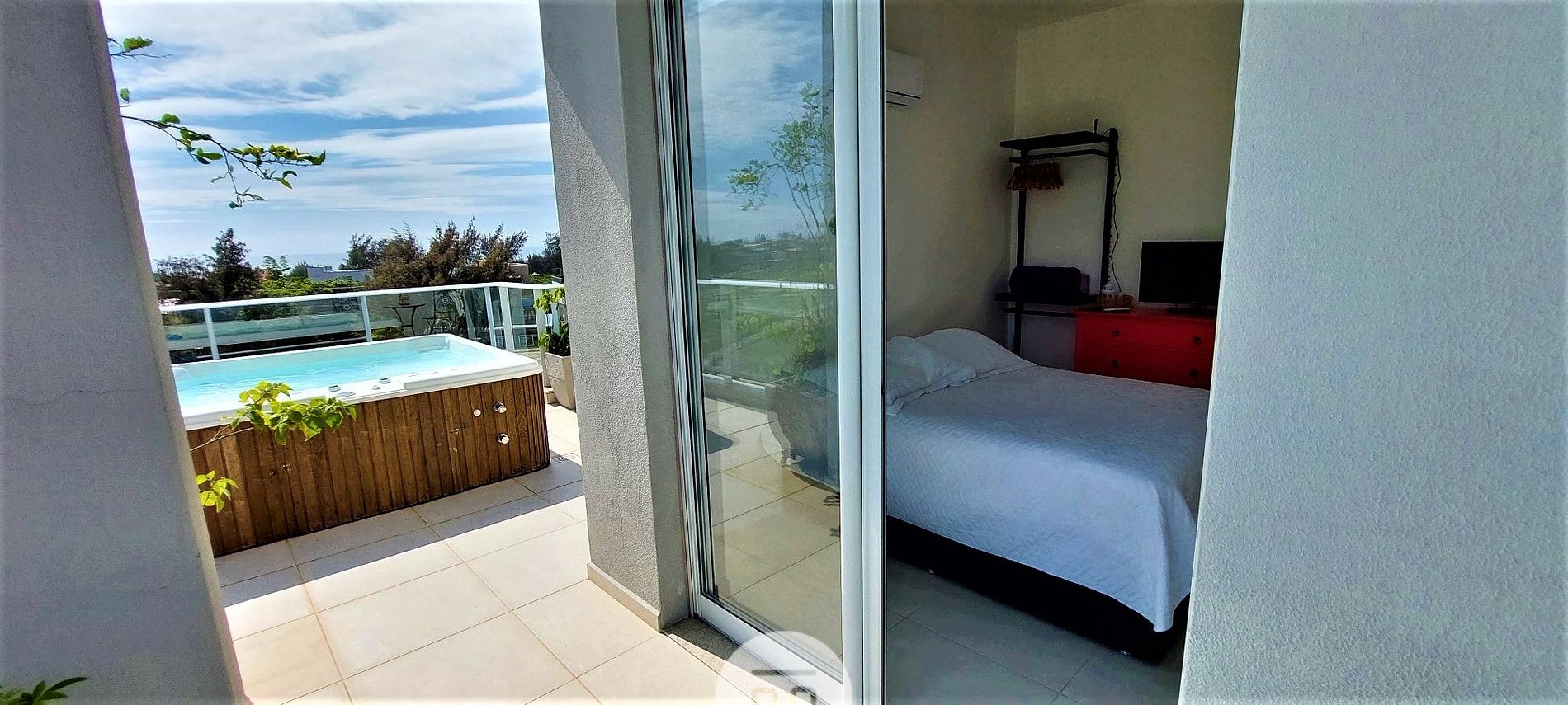 Está a cuadras de una playa muy linda y tranquila pero no nada más cerca. Es un barrio lejos de comercios y restaurantes. La terraza es lo más lindo del depto, con mesitas para desayunar viendo el paisaje y un jacuzzi
