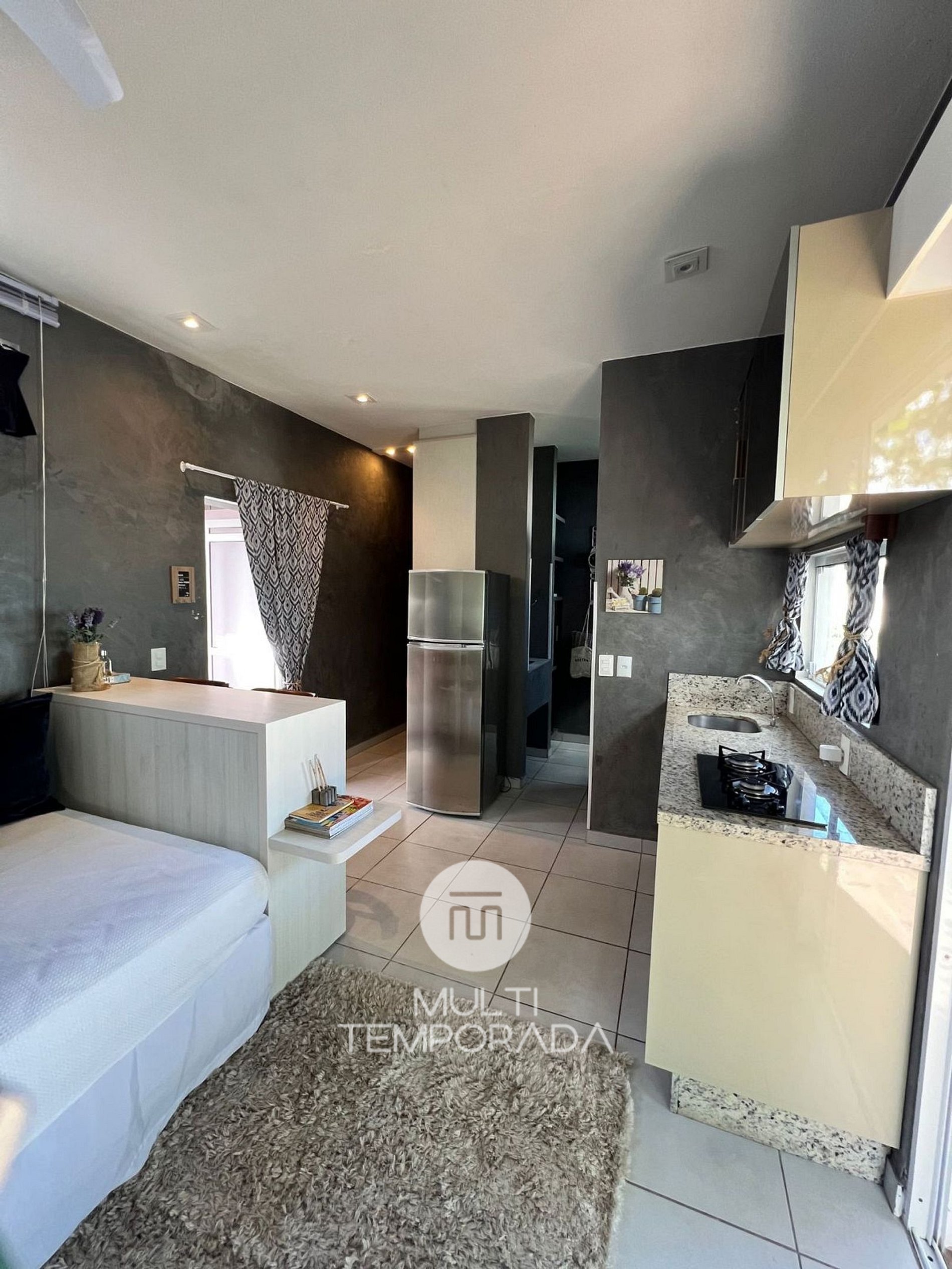 O Loft Jardim possui 22m² e possui suíte climatizada com cama de casal, cozinha completa e área de jantar;