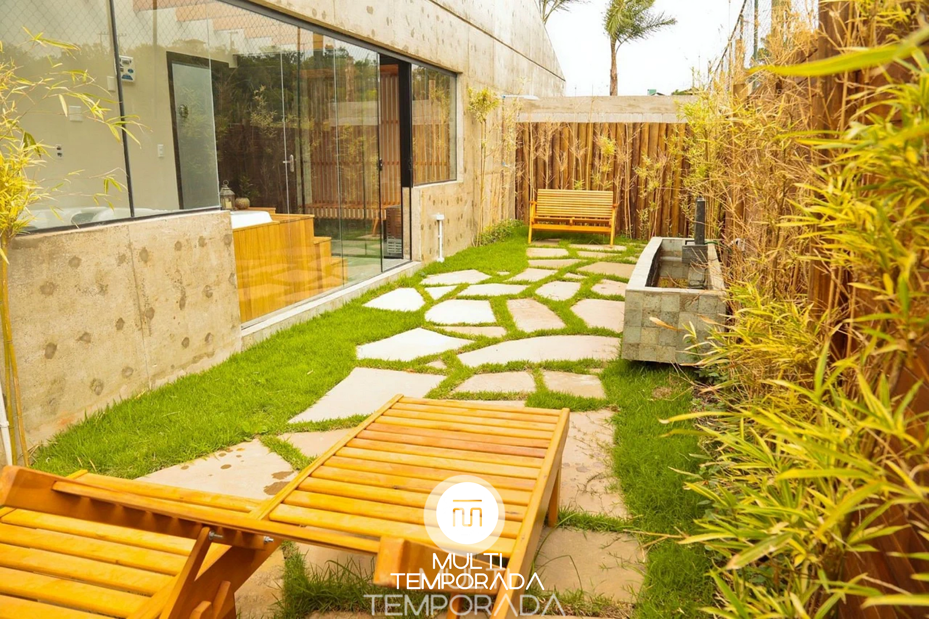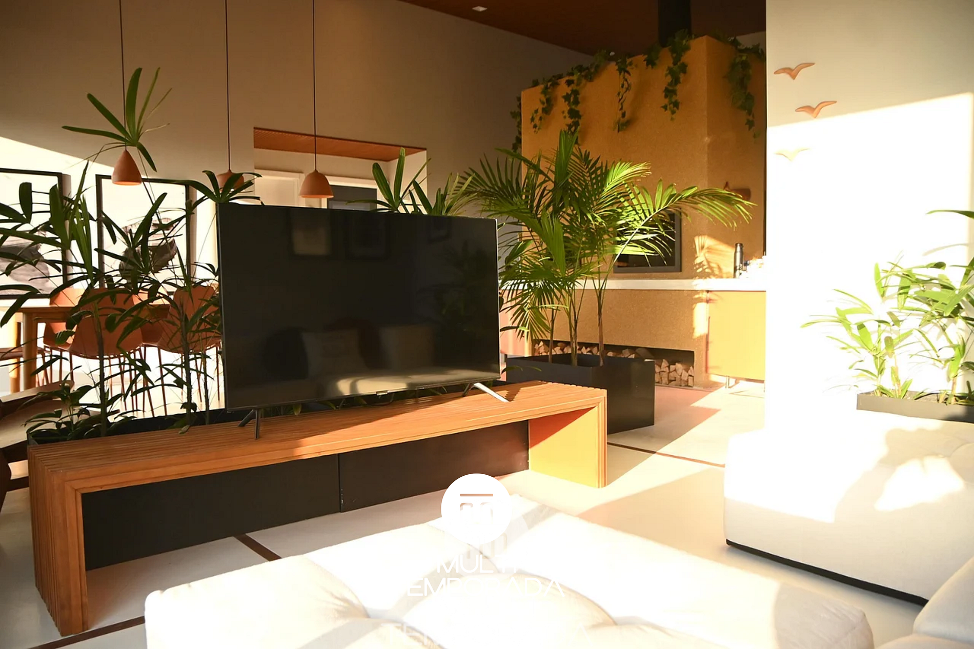 • Sala com três ambientes, deck externo e banco de contemplação;