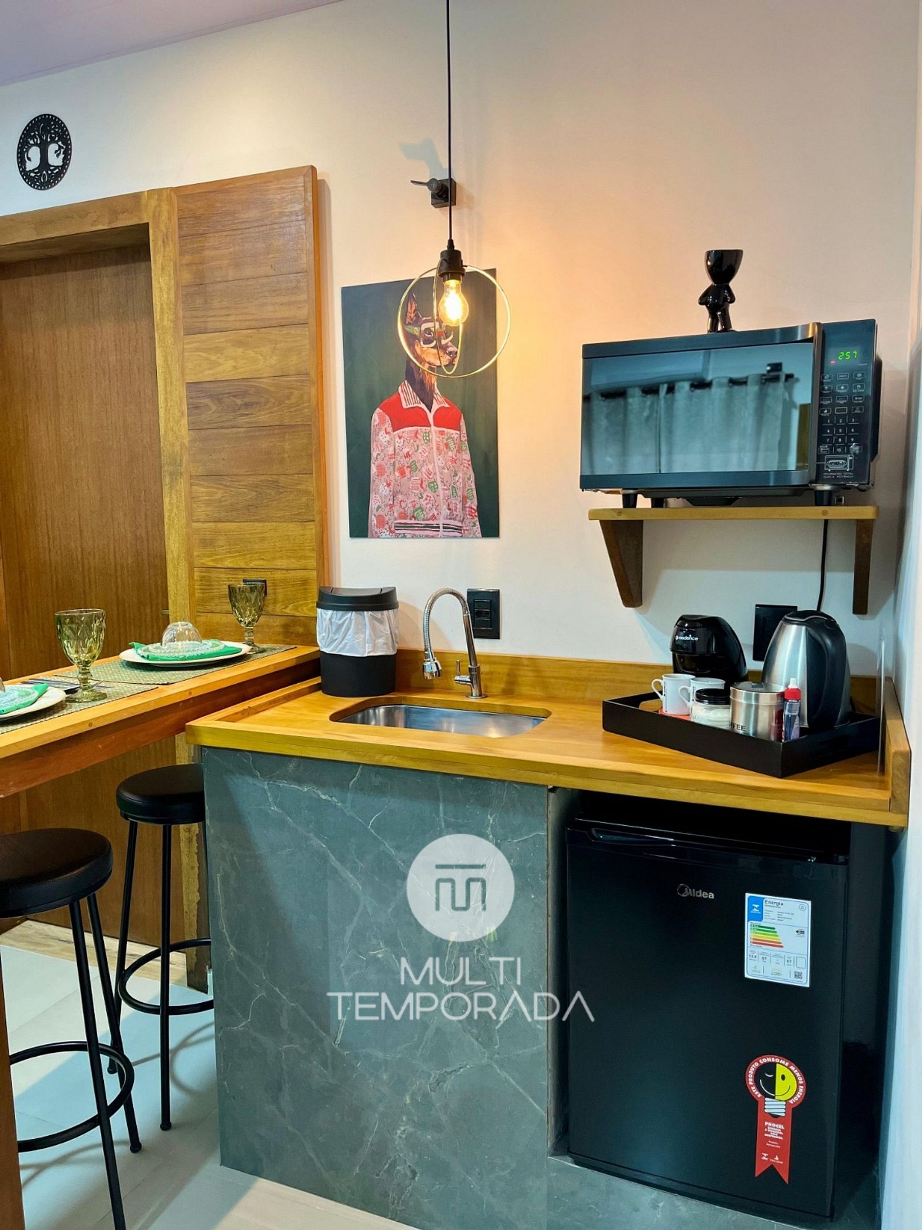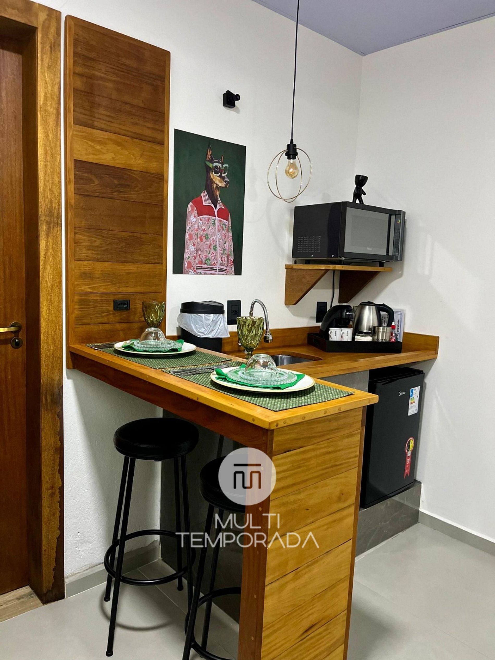 A unidade conta com banheiro privativo e uma mini cozinha equipada com frigobar, micro-ondas, cafeteira, chaleira elétrica, louças, talheres e itens de cortesia como café, chá, açúcar e adoçante. Perfeita para quem gosta de ter autonomia durante a estadia.