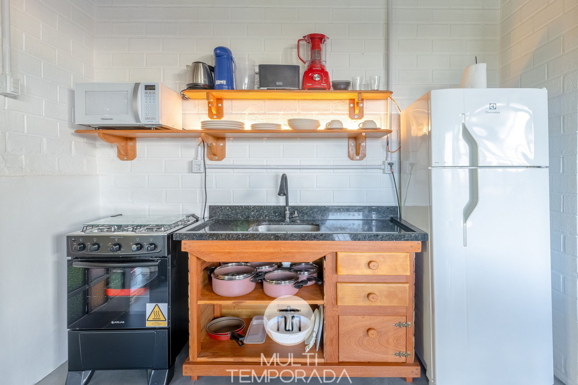 Cozinha completa: equipada com fogão a gás, geladeira, micro-ondas, chaleira elétrica, torradeira, louças e talheres — tudo o que você precisa para preparar suas refeições com conforto.