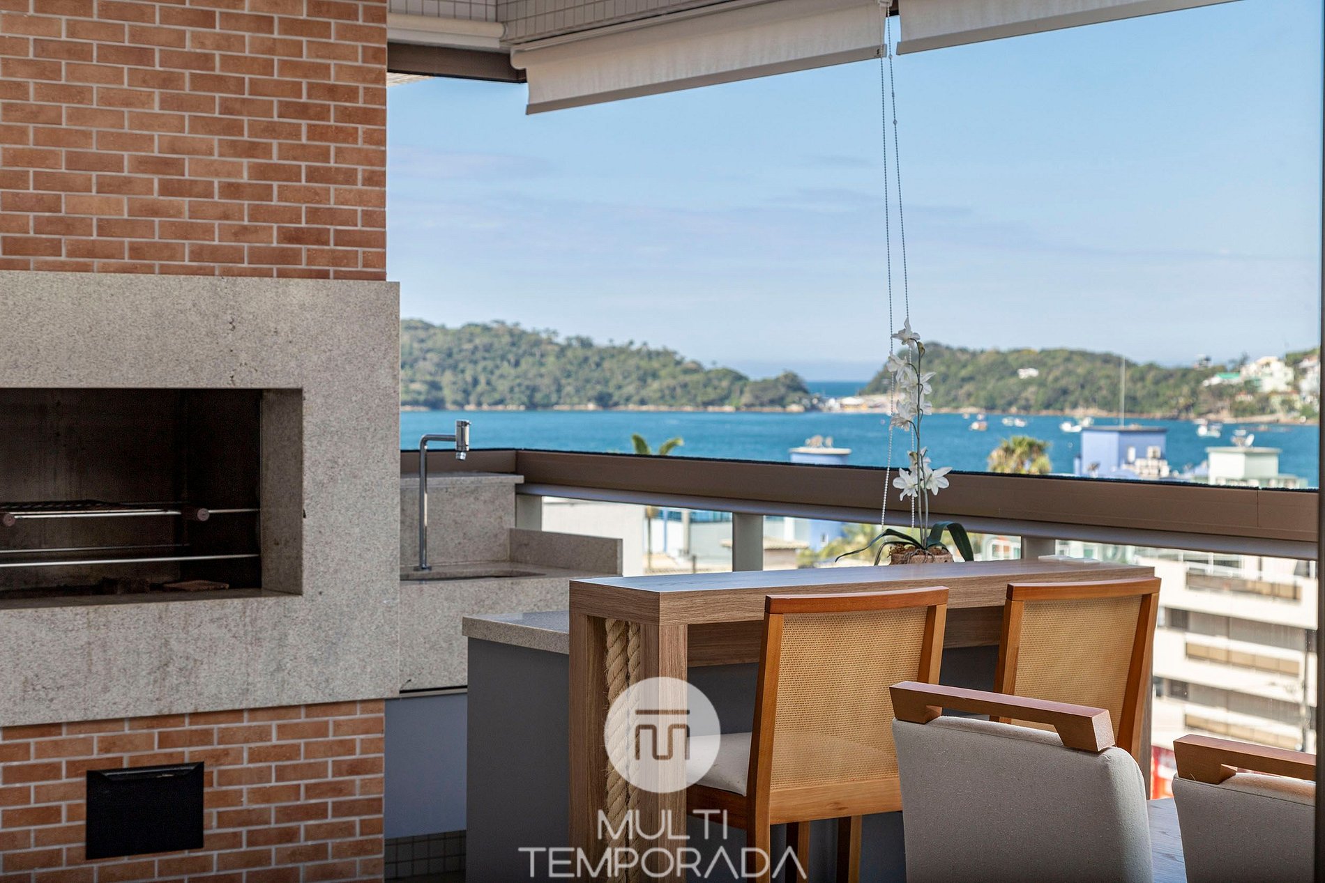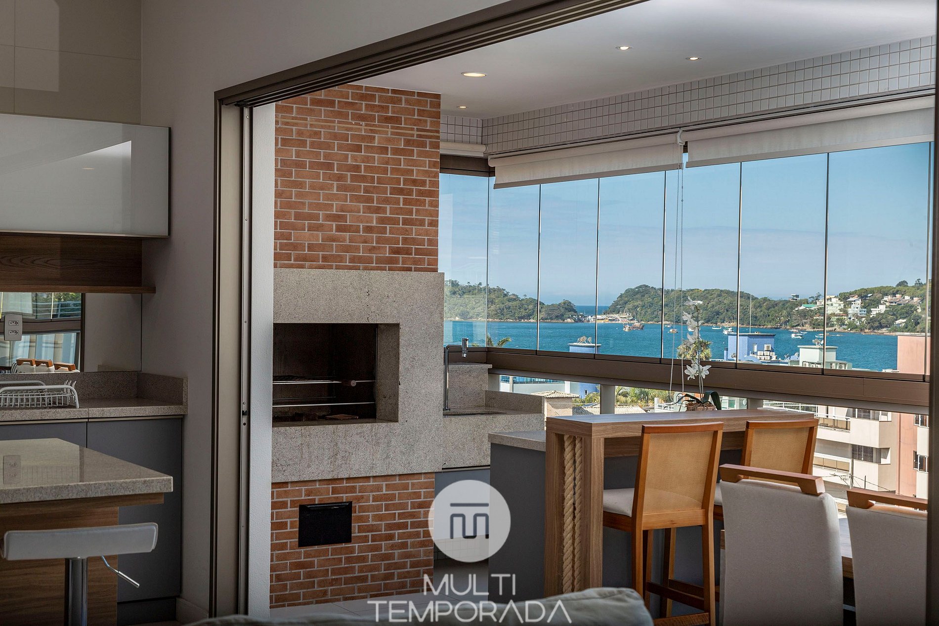 Sacada fechada com churrasqueira e vista para a cidade e o mar