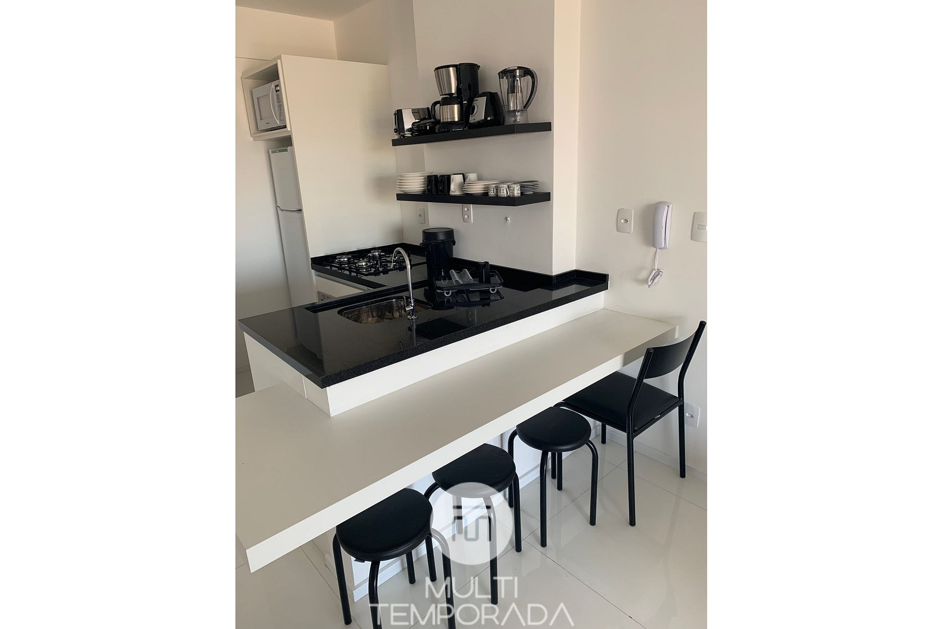 O apartamento de quarto e sala tem 43 m2, sacada com pequena vista do mar e montanha, churrasqueira, cozinha completa, dois splits, Wi-fi, TV a cabo, cama de casal e sofá-cama de casal.