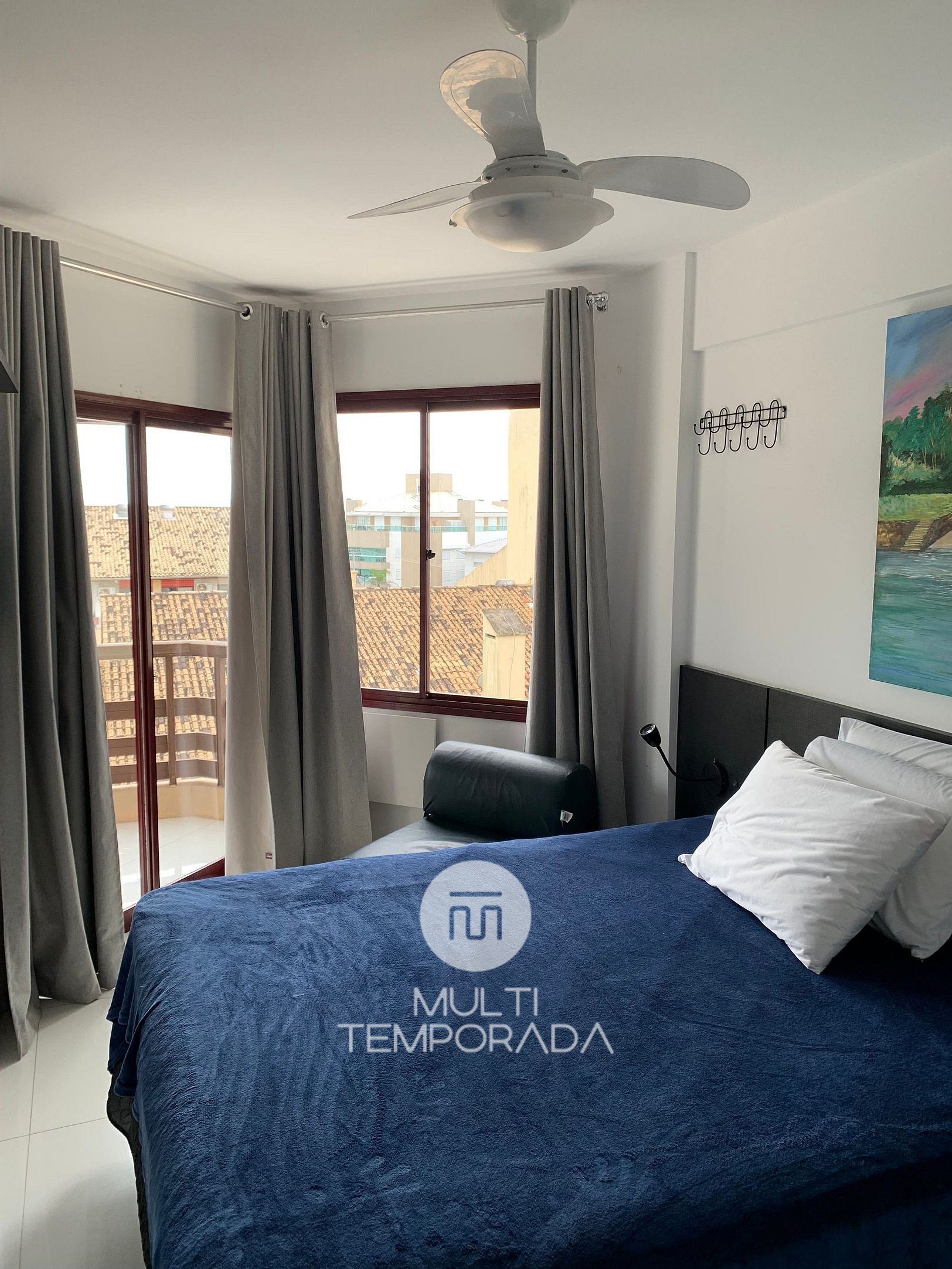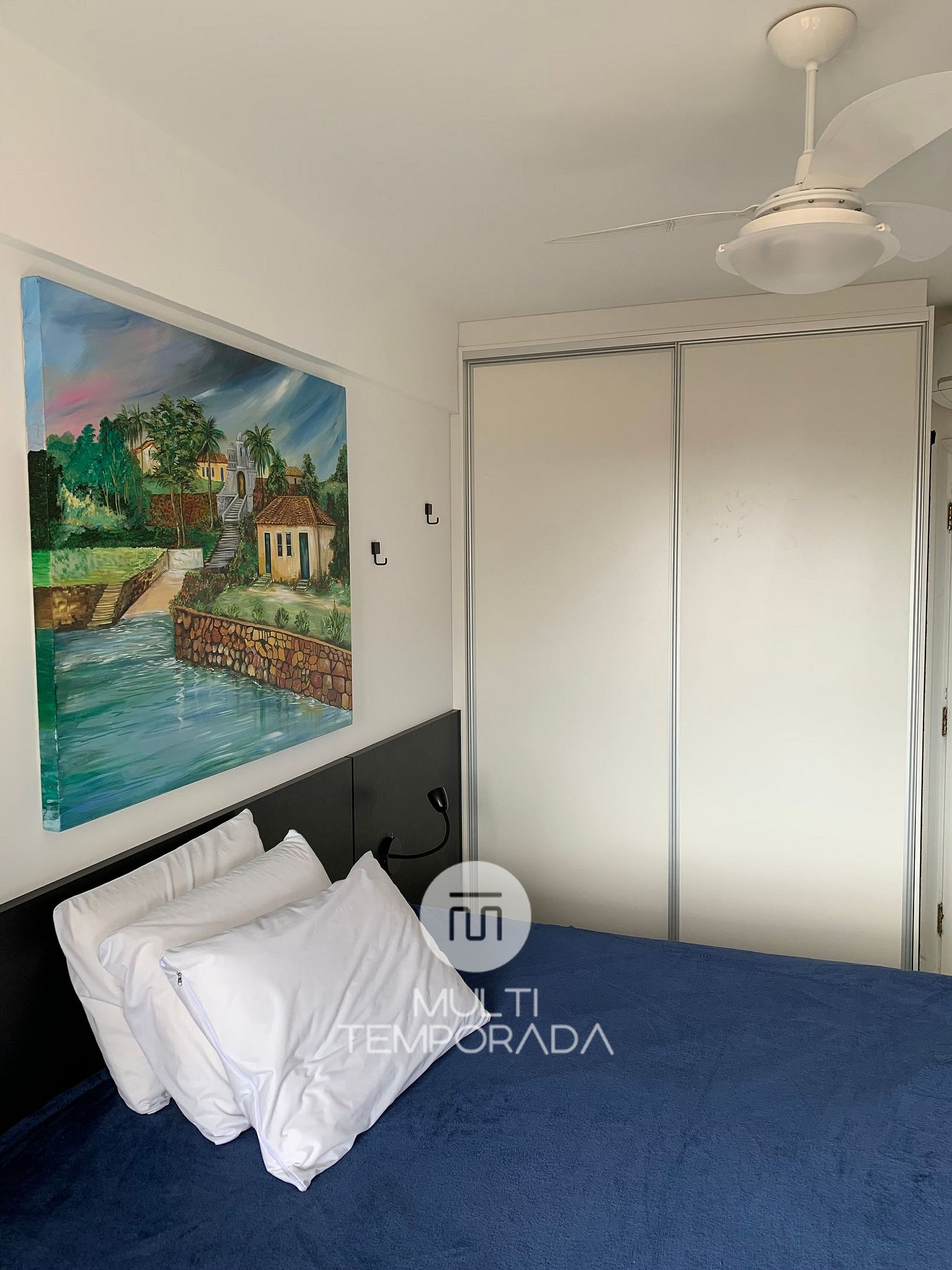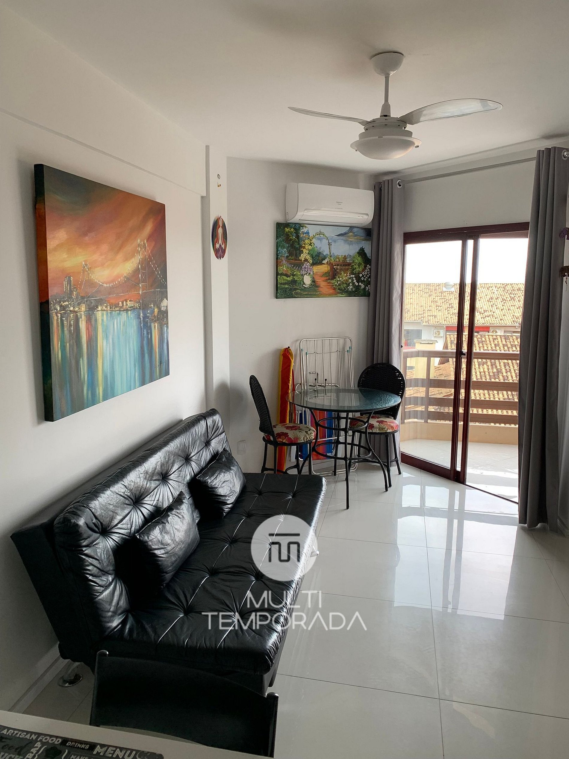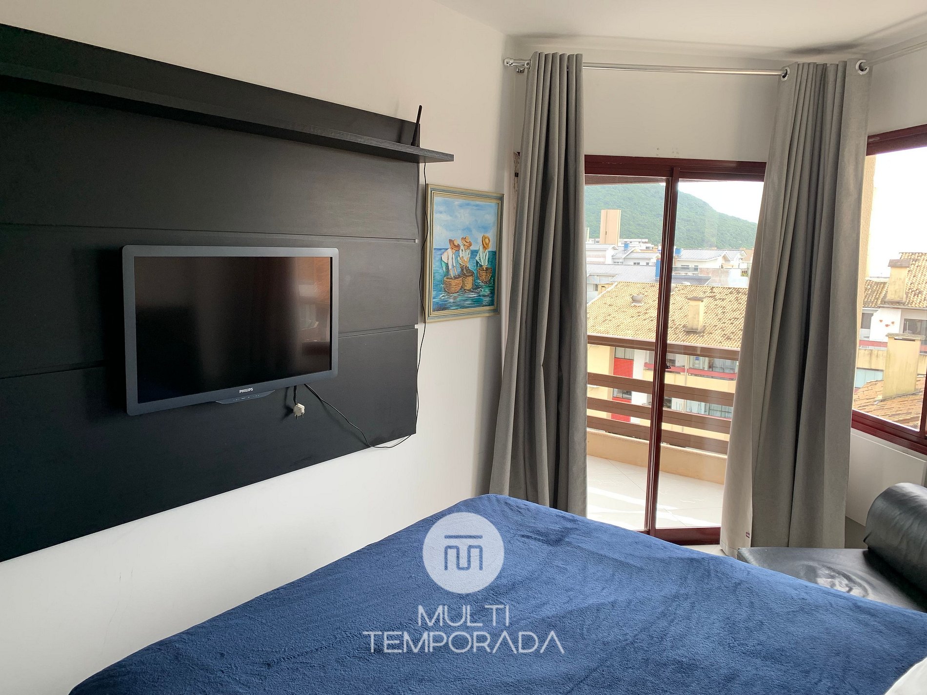 O apartamento de quarto e sala tem 43 m2, sacada com pequena vista do mar e montanha, churrasqueira, cozinha completa, dois splits, Wi-fi, TV a cabo, cama de casal e sofá-cama de casal.